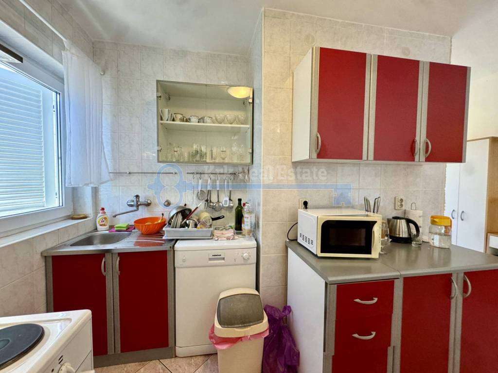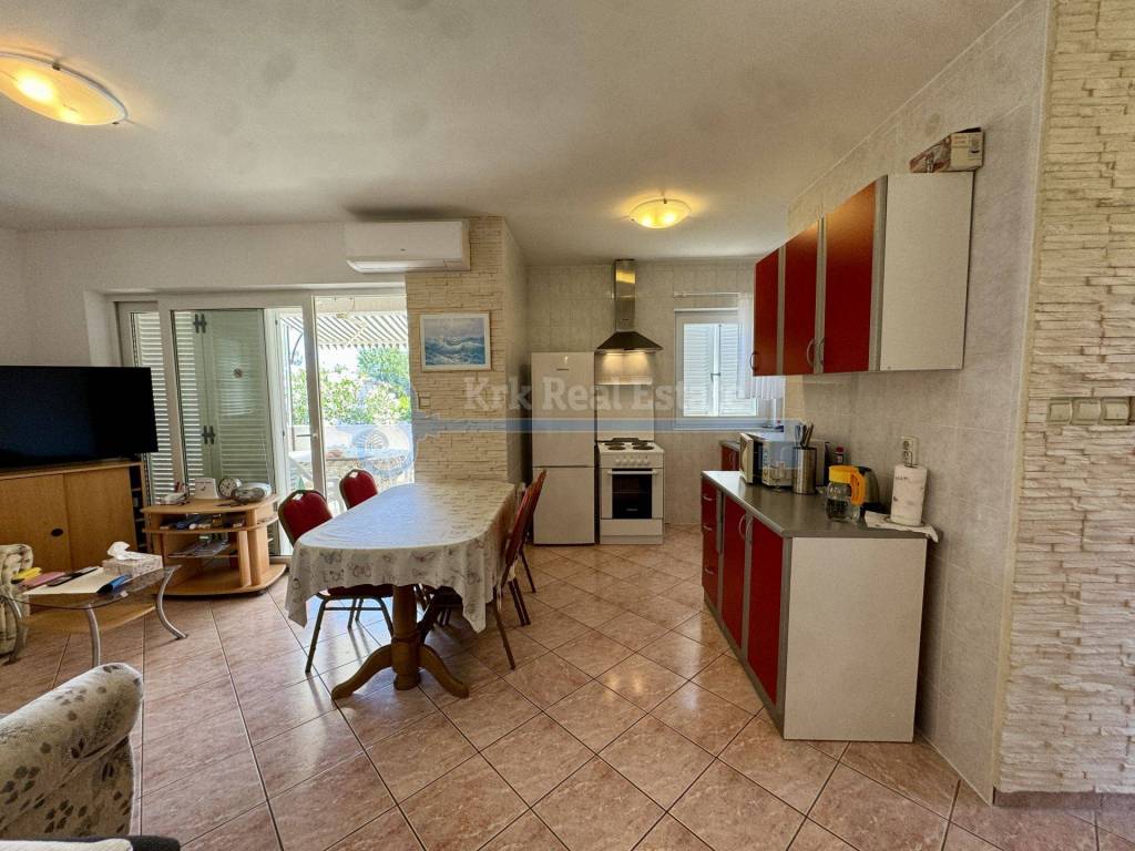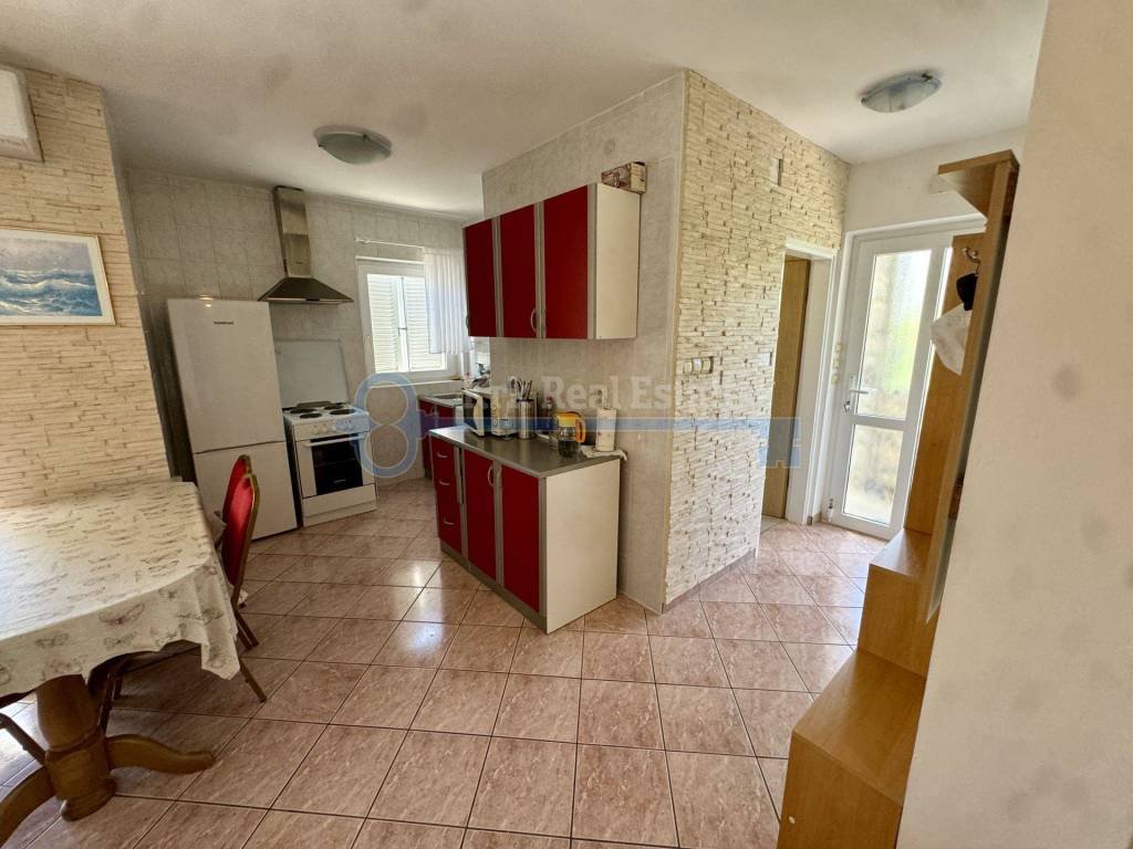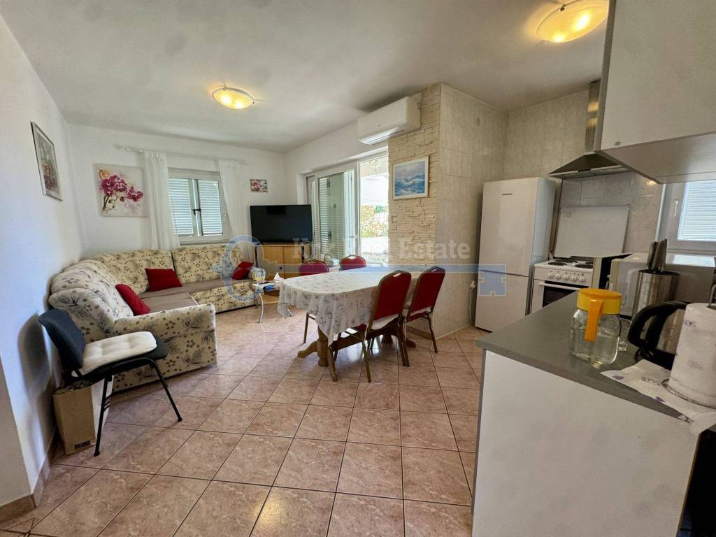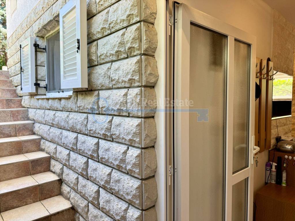 For sale is a nice one-story house with a living area of 100 m2, located in a quiet place near the sea and beaches. It consists of two apartments, one in the basement and the other on the ground floor. The apartment in the basement contains a living room, kitchen, dining room, two bedrooms and a bathroom, as well as a storage room. The apartment on the ground floor contains two bedrooms, a living room and a kitchen with a dining room, a bathroom and a balcony. It has a garden area of 600 m2, where there is a swimming pool with space for relaxing and socializing, a barbecue and a covered parking space for cars. It is only 850m away from the sea and beautiful beaches.