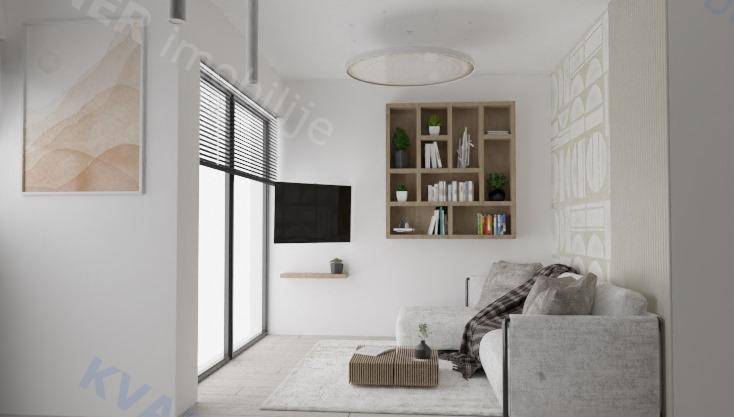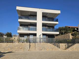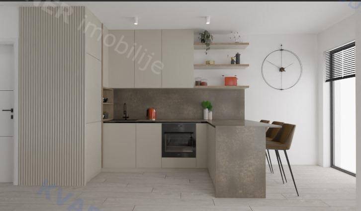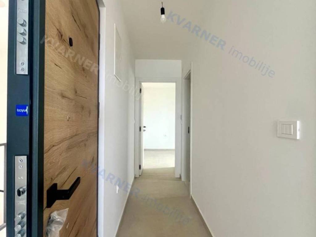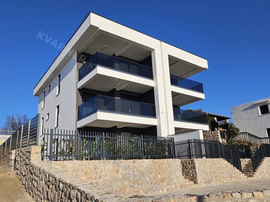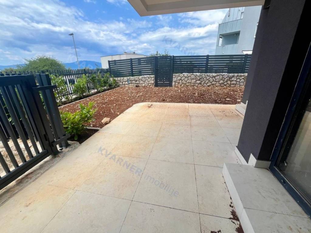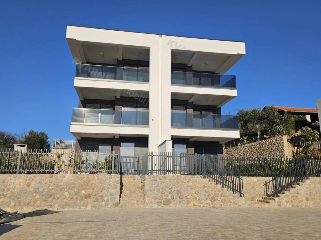 A modern ground floor apartment in a new building in Omišalj on the island of Krk, just 150 meters from the sea, with a private pool and sea view, is for sale. The apartment has 67 m² and consists of a living room with kitchen and dining area, two bedrooms, a bathroom, an additional toilet, and a spacious terrace that leads to a private pool with a sunbathing area.