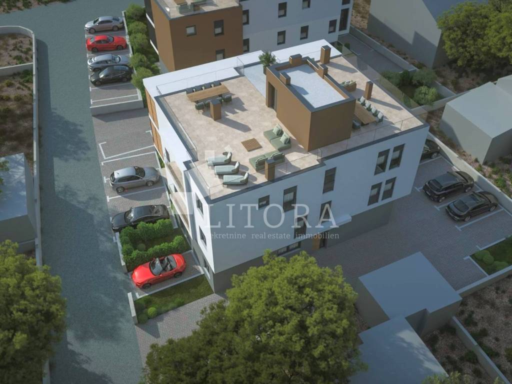 Vodice – New Modern Apartment with Rooftop Terrace, 600 m from the Beach. Spacious and modern apartment S6 with a total area of 142,85m², located on the second floor of a new residential building with eight units in total.