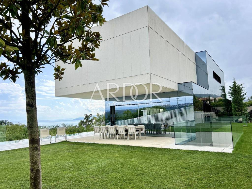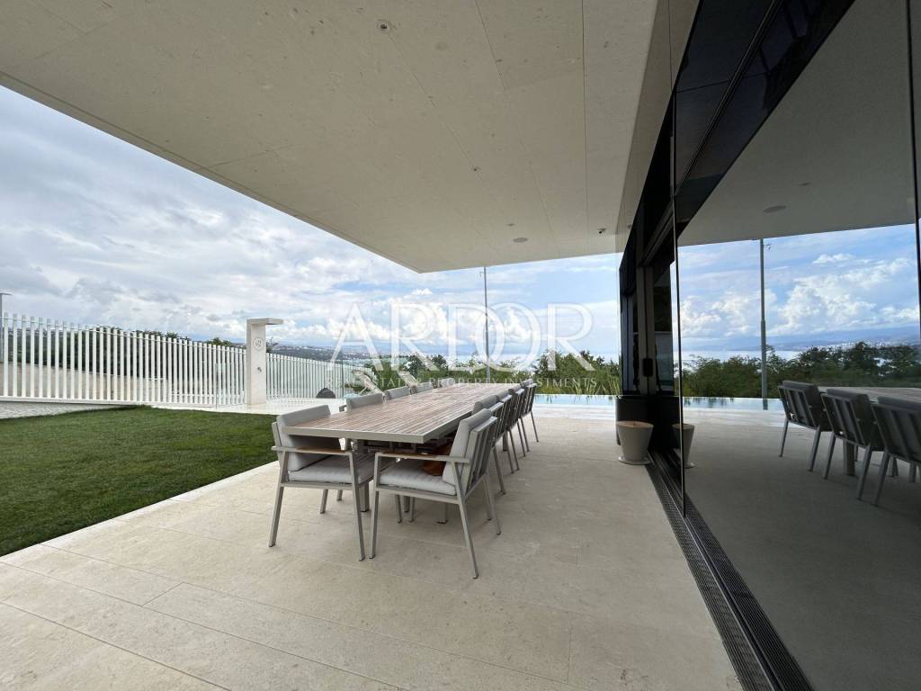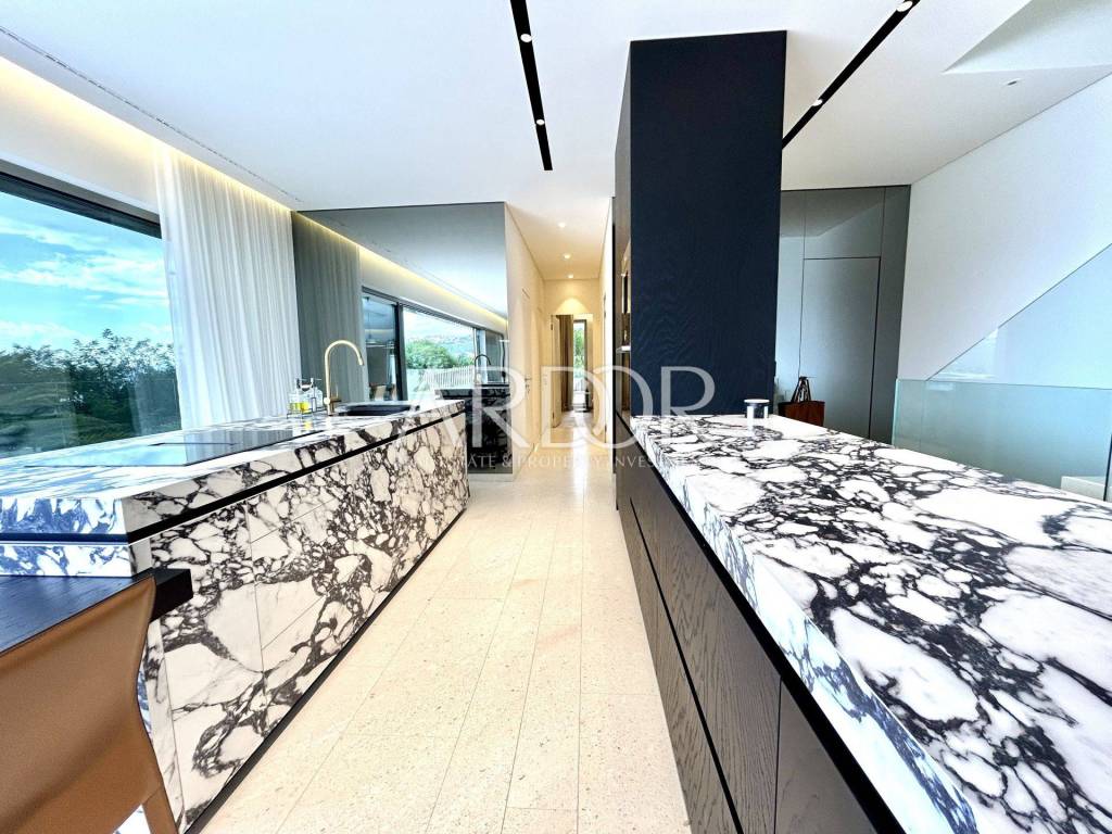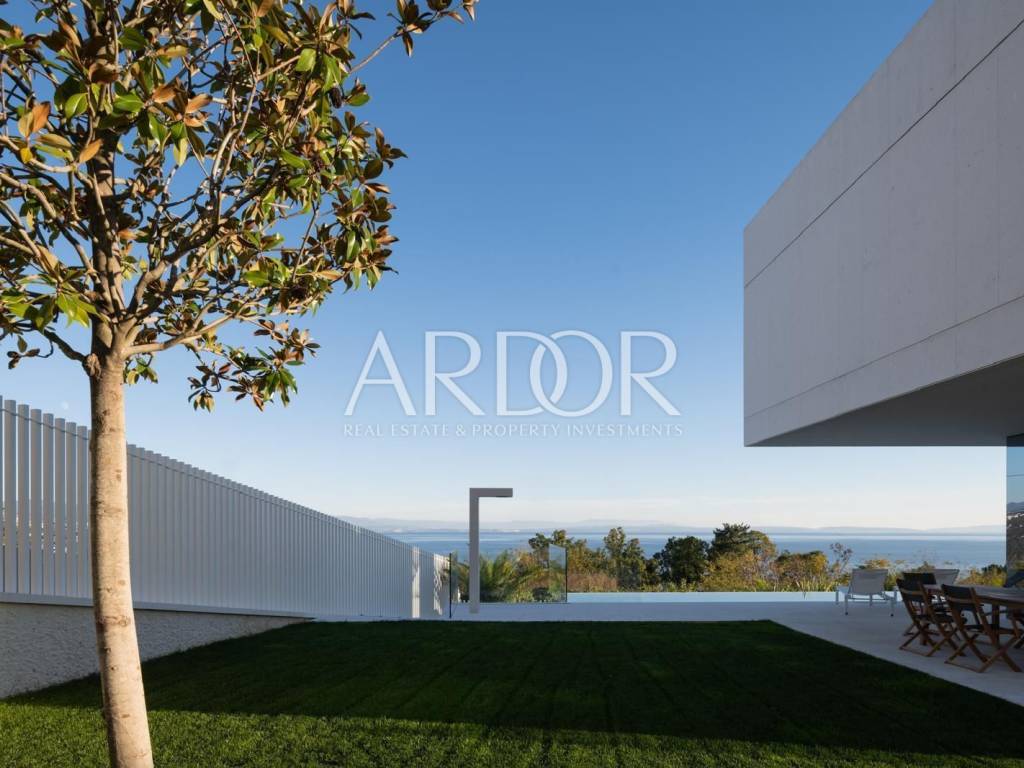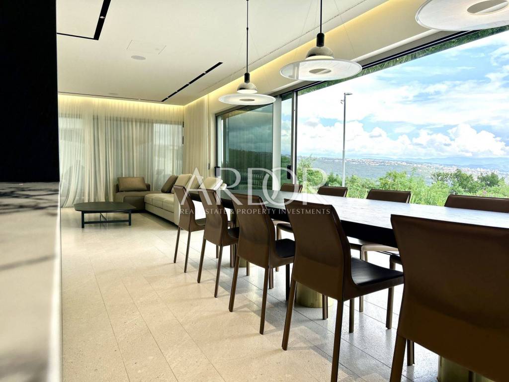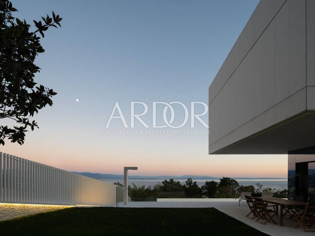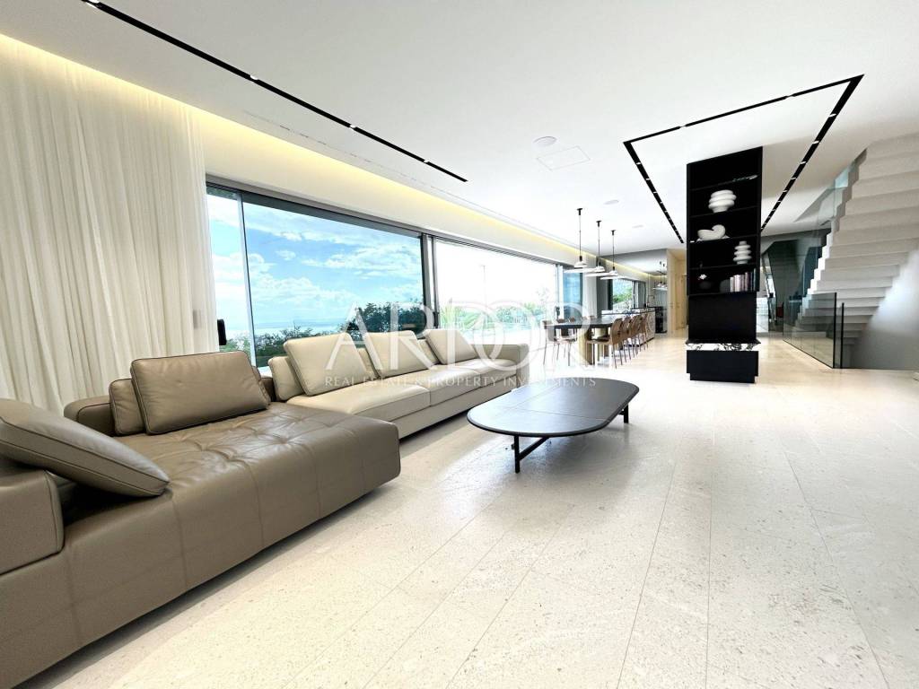 This modern villa offers a total of 380 m² of terraces, a 45 m² infinity pool, and exotic greenery within the private garden, making it unique on the Opatija Riviera. The interior is further enriched by atriums and outdoor sunken spaces in the basement, which are connected to the gym and sauna.