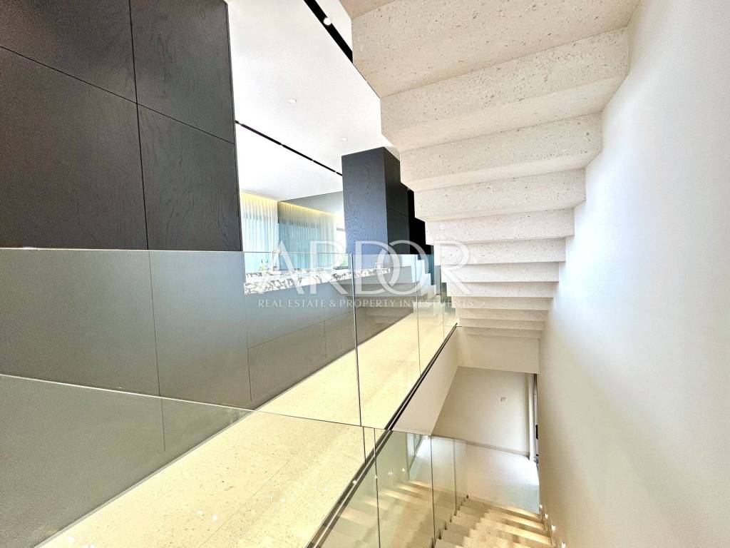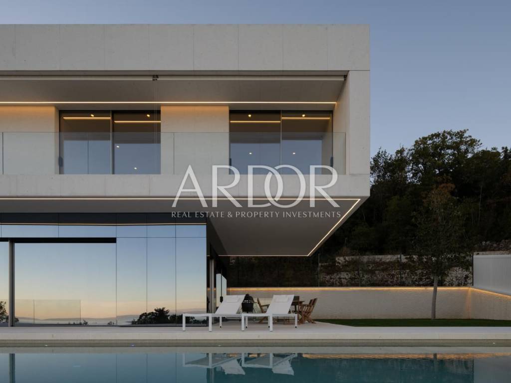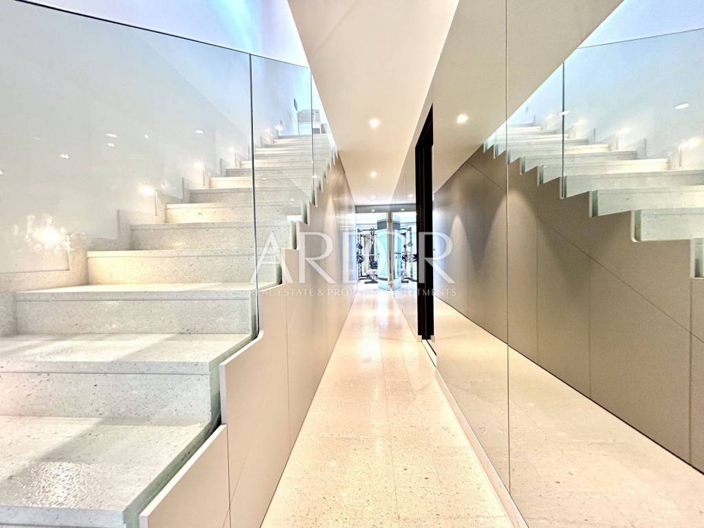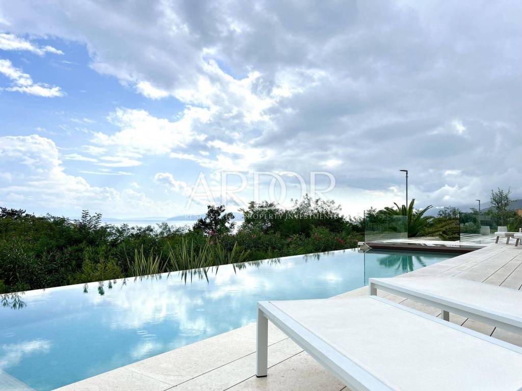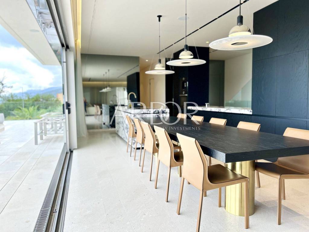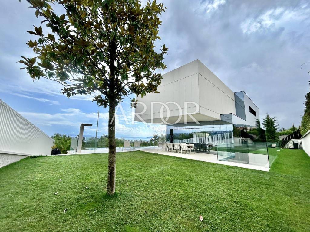 This modern villa offers a total of 380 m² of terraces, a 45 m² infinity pool, and exotic greenery within the private garden, making it unique on the Opatija Riviera. The interior is further enriched by atriums and outdoor sunken spaces in the basement, which are connected to the gym and sauna.