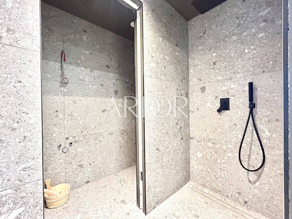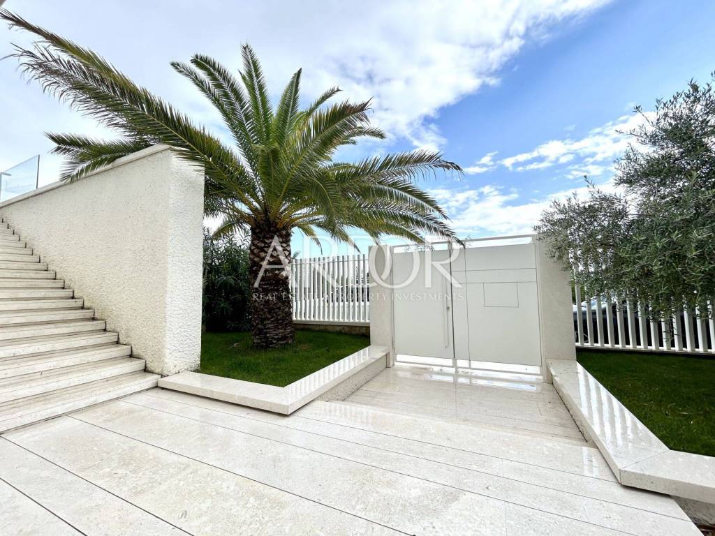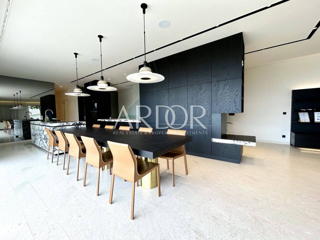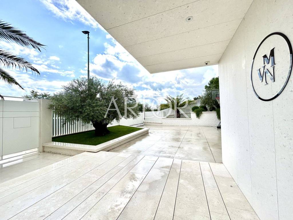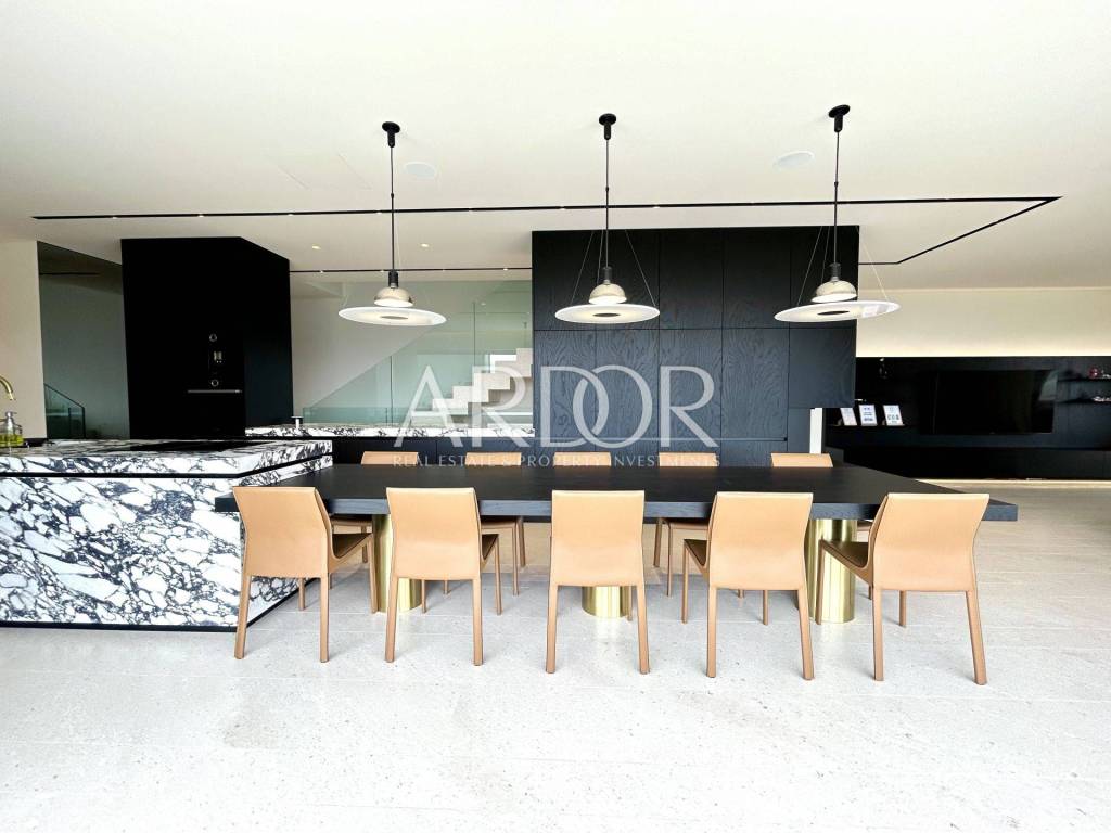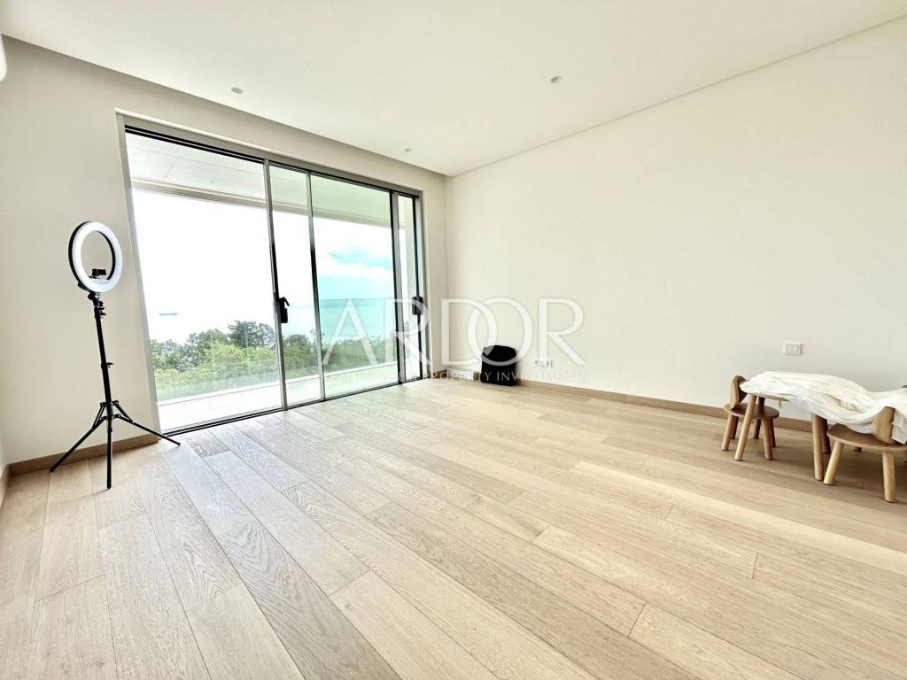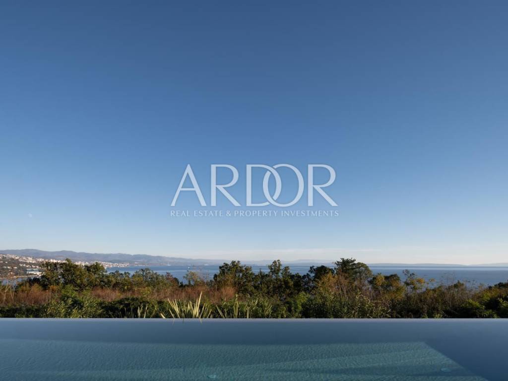 This modern villa offers a total of 380 m² of terraces, a 45 m² infinity pool, and exotic greenery within the private garden, making it unique on the Opatija Riviera. The interior is further enriched by atriums and outdoor sunken spaces in the basement, which are connected to the gym and sauna.