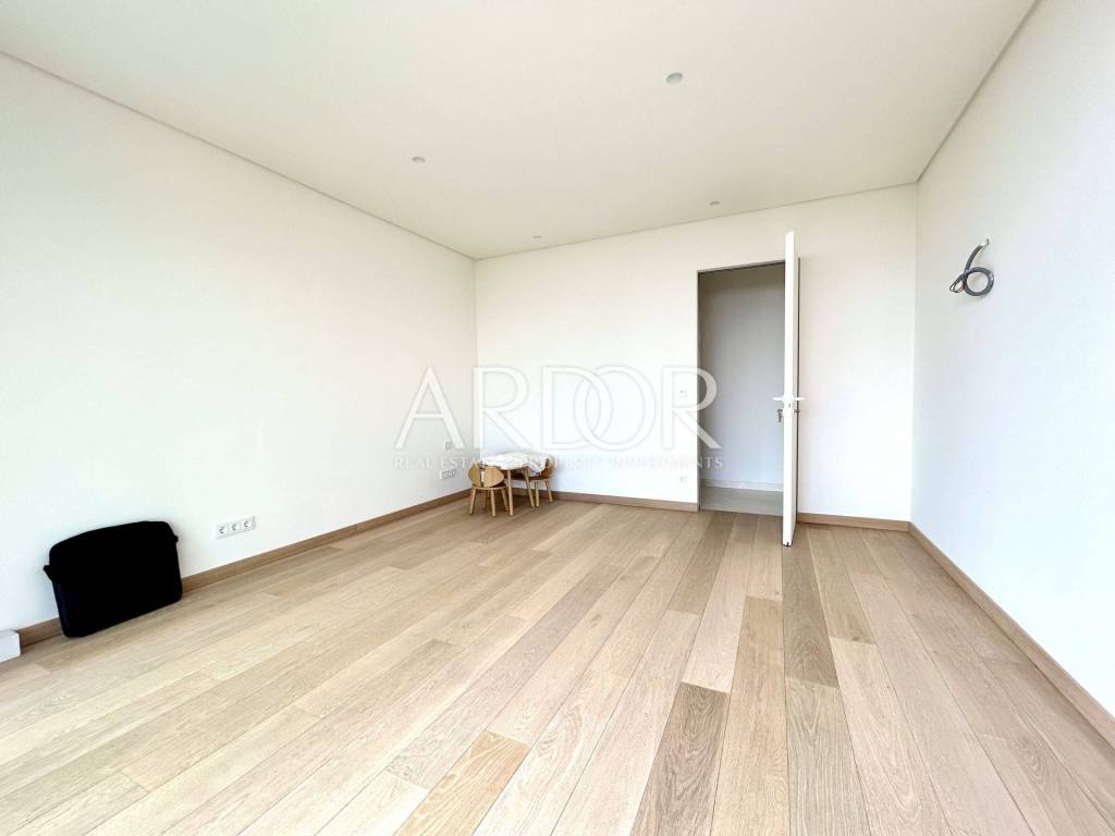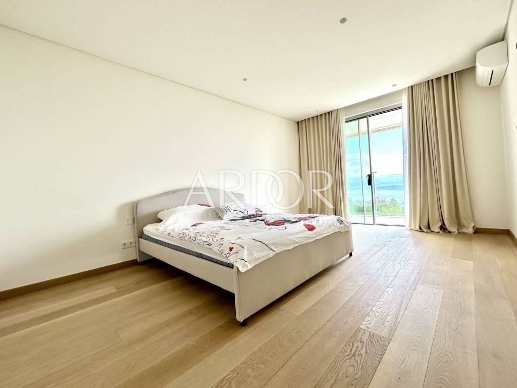 On the first floor, there are three bedrooms and two bathrooms, each with glass walls and access to the 23 m² outdoor terrace. The master bedroom, sized at 26 m², has an en-suite bathroom with glass walls, providing an incredible view of Kvarner. The other two bedrooms (20 m² and 17 m²) are conveniently connected by a terrace and a large bathroom.