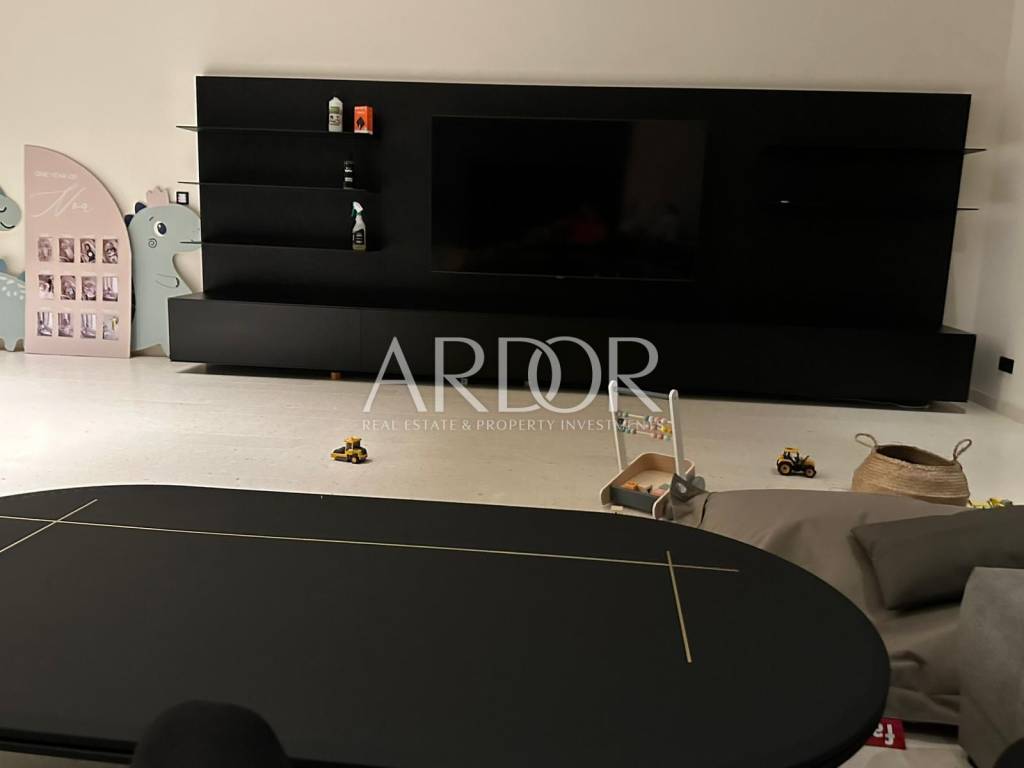 The staircase leads to the ground floor, where there is a 95 m² open-plan living room that includes the living area, kitchen island, and dining area. This space is connected to one bedroom with its own bathroom, a toilet, a hallway, a storage room, and an office. A unique feature of the kitchen is the rotating elements facing the sea, offering a breathtaking view of Kvarner Bay.