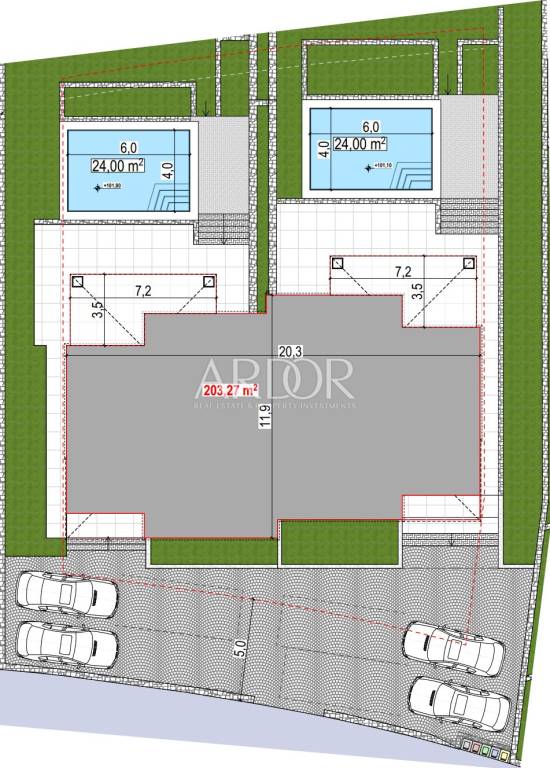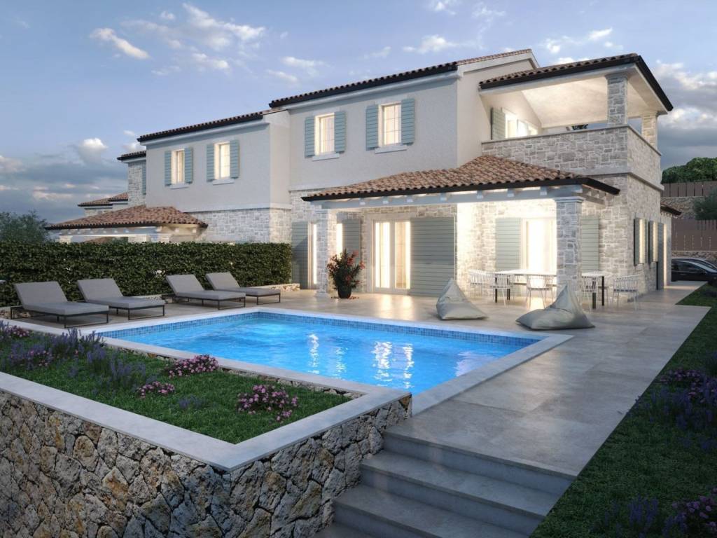Građevinsko zemljište površine 989,8 m2 sa projektom predanim za ishodovanje građevinske dozvole. Svaka od obje stambene jedinice ove luksuzne vile ima svoj privatni bazen, vanjsku natkrivenu terasu, vrt, više parkirnih mjesta i podrum.