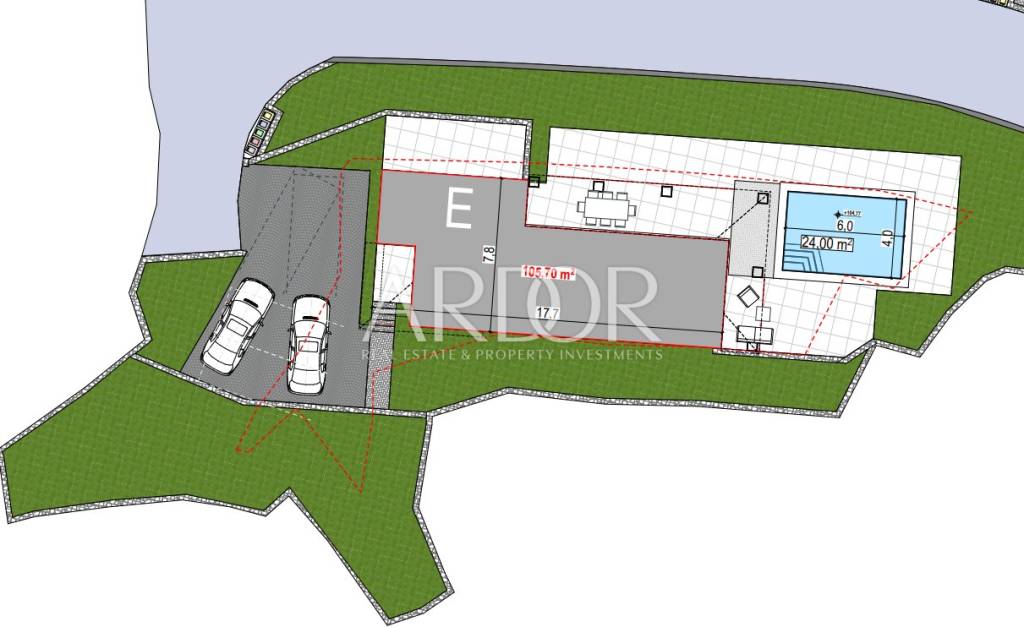 Planirana vila na ovom zemljištu će imati komforan ​​privatni bazen, natkrivenu terasu, vrt, parkiralište i podrum. U prizemlju, stambene površine od 133,38 m2, nalaziti će se prostrana kuhinja, dnevni boravak i jedna spavaća soba s kupaonicom, dok će se na katu, s površinom od 75,55 m2, nalaziti tri sobe i tri kupaonice.
