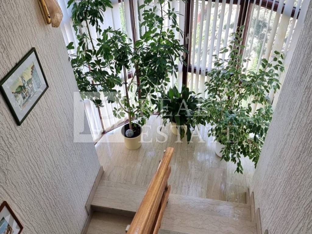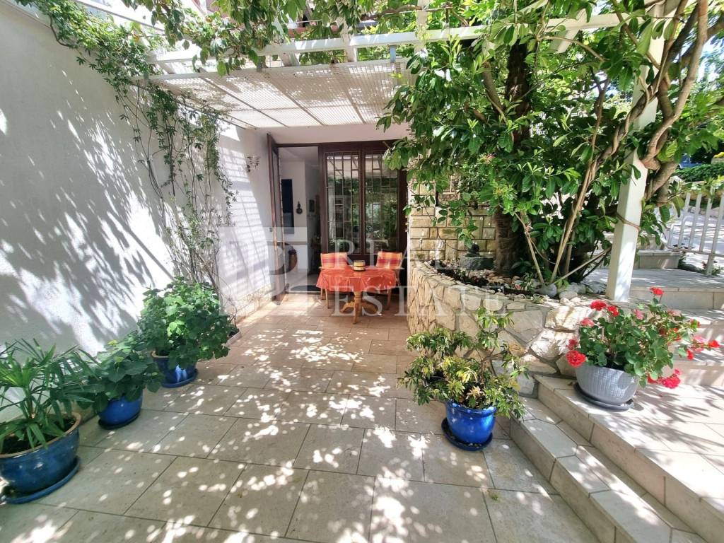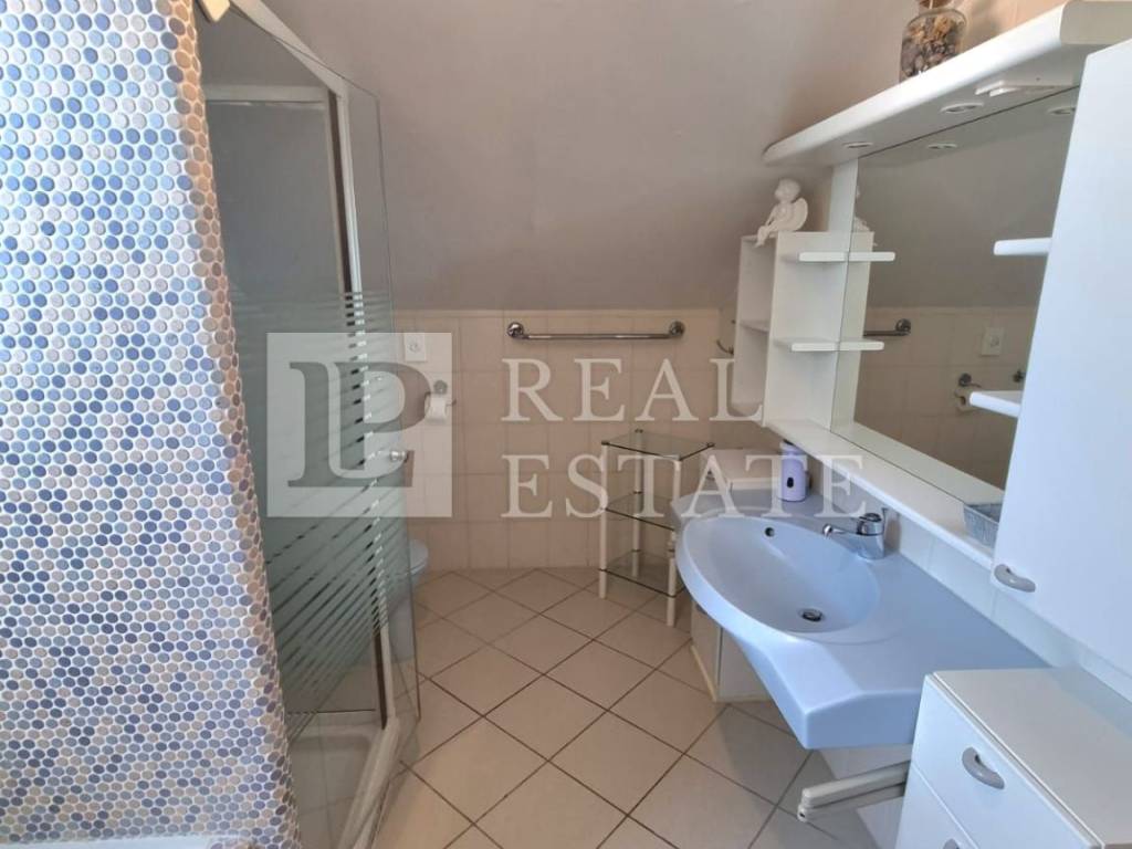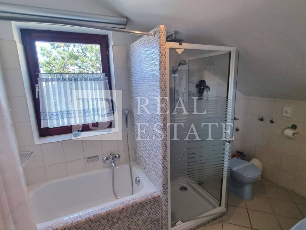 On the ground floor there is one one-room apartment, two garages, a laundry room, a sauna, a boiler room and storage rooms, as well as additional rooms. The first and second floors and the high attic have the same layout of rooms, and the area of each apartment of 120 m2 consists of a hallway, bathroom, toilet, two bedrooms, kitchen, dining room, living room and a spacious terrace with an open view of the sea. The ground floor has a separate entrance, while the upper floors are connected by internal stairs.