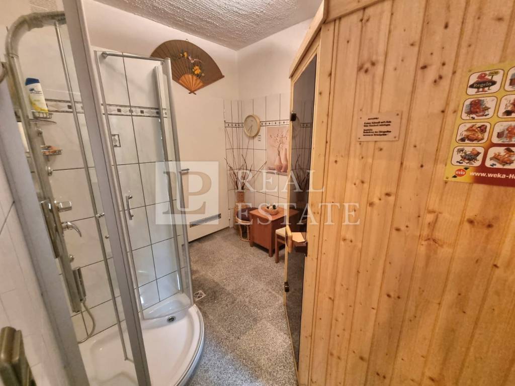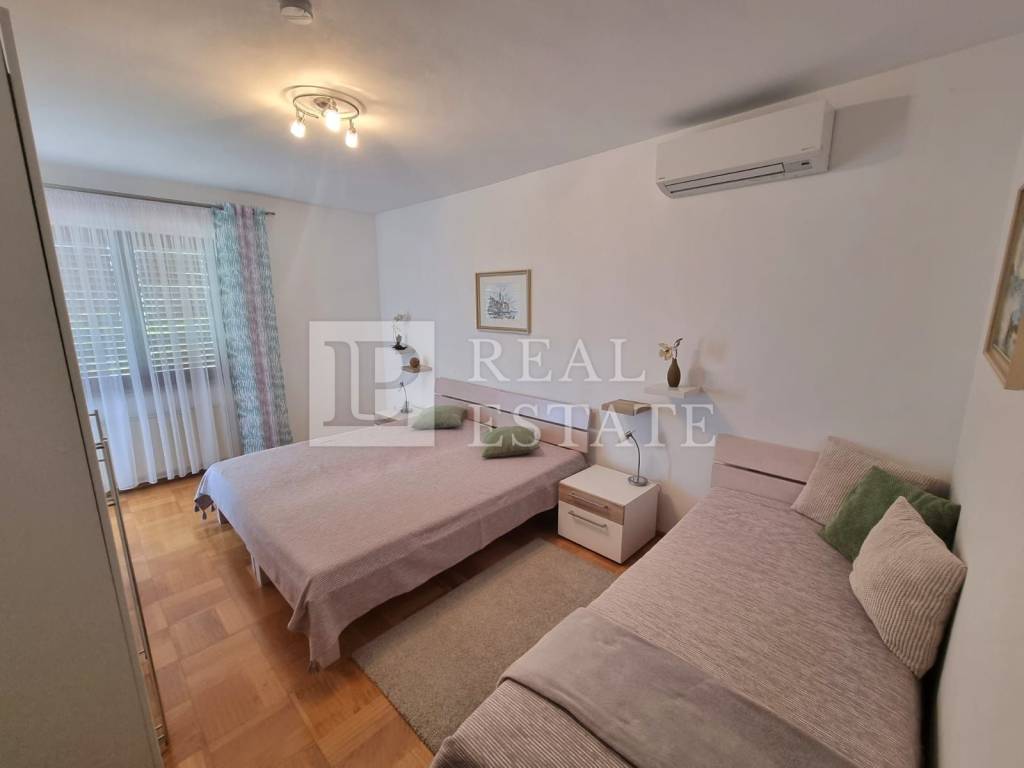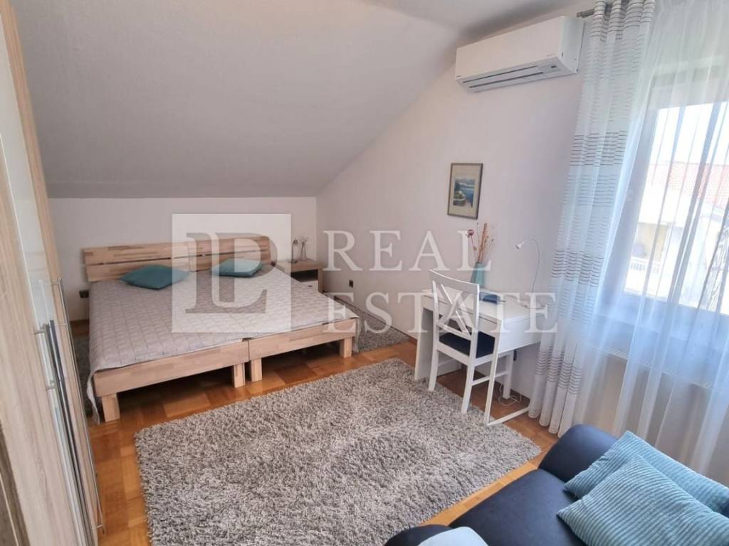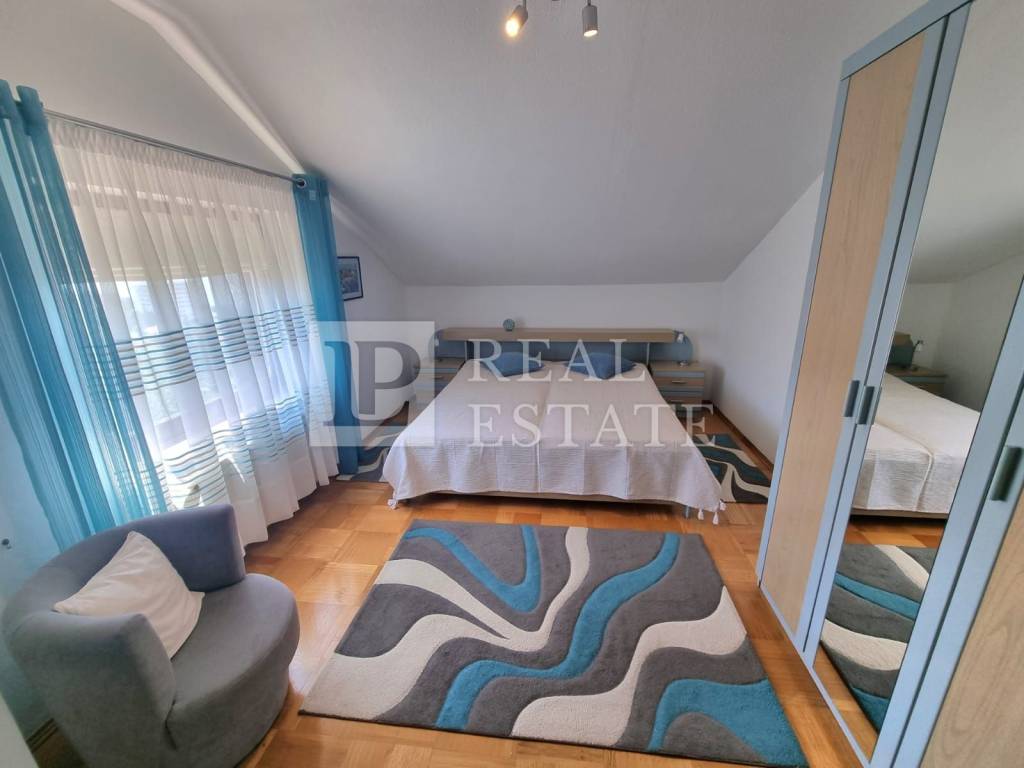 On the ground floor there is one one-room apartment, two garages, a laundry room, a sauna, a boiler room and storage rooms, as well as additional rooms. The first and second floors and the high attic have the same layout of rooms, and the area of each apartment of 120 m2 consists of a hallway, bathroom, toilet, two bedrooms, kitchen, dining room, living room and a spacious terrace with an open view of the sea. The ground floor has a separate entrance, while the upper floors are connected by internal stairs.