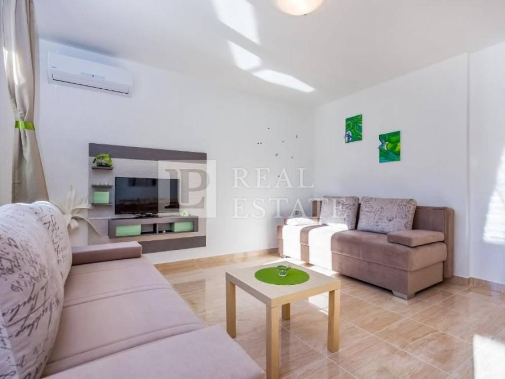The second half of the villa consists of a two-story apartment consisting of a hallway, a kitchen with a dining room, a living room, a bathroom, a storage room and a terrace on the ground floor and two bedrooms, a hallway, a bathroom and a terrace on the first floor.