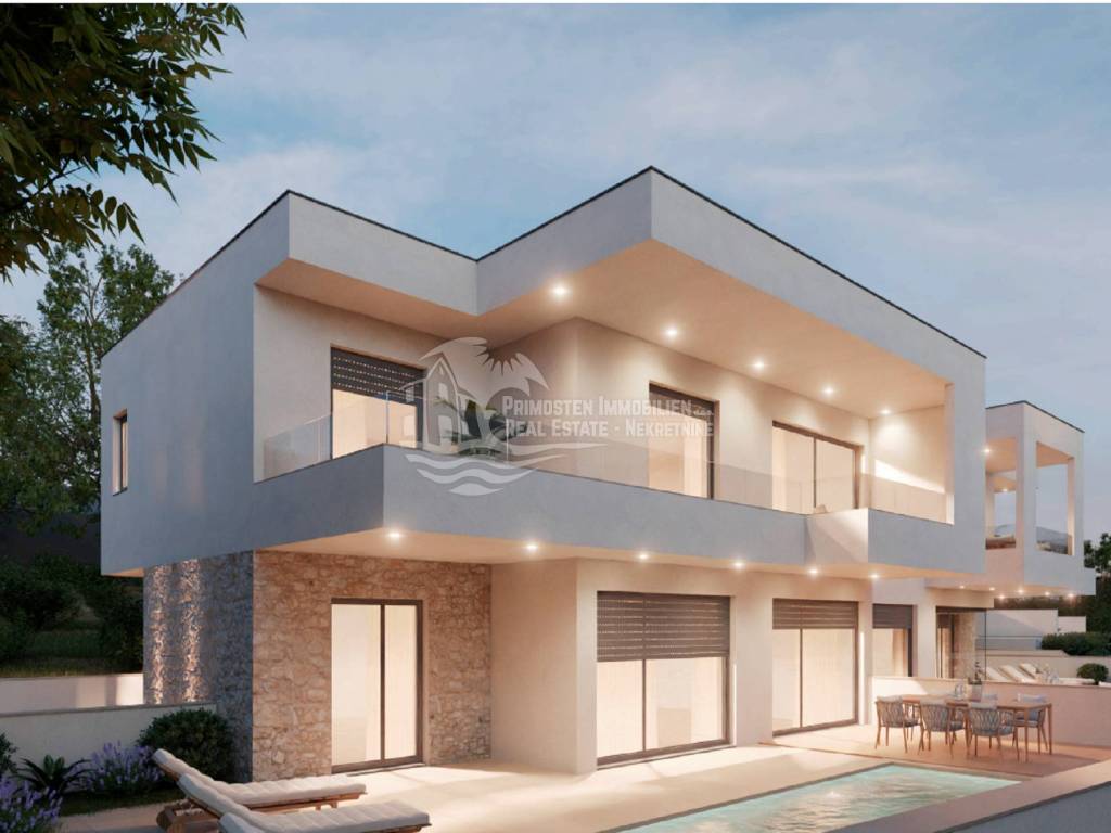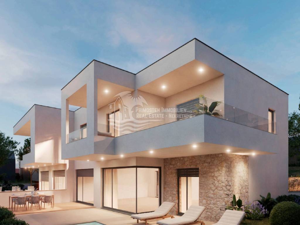 UNIQUE OFFER! We are mediating the sale of a luxury semi-detached house S2 in Primosten, 500 m from the beautiful beaches of Primosten and the crystal clear sea. This beautiful house has a living area of 166,25 m2 and extends over two floors. On the first floor, there is a spacious living room, kitchen and dining room, bedroom, bathroom, storage room, and hallway. From the living room and the bedroom, there is access to the terrace where there is a heated swimming pool ideal for enjoying warm summer days and all year round and a garden. The terrace offers a beautiful view of the sea. An internal staircase leads to the first floor, where there are three bedrooms and two bathrooms. Each of the bedrooms has access to the terrace and a view of the sea. There is one outdoor parking space in front of the house. During the construction and furnishing of this house, the most modern materials and equipment will be used to ensure top quality, comfort and energy efficiency. This luxury house also includes video surveillance and an alarm system that ensures maximum security. It is additionally equipped with solar systems, which reduces electricity costs and makes it environmentally friendly. A quiet location, close to tourist facilities, quality construction, close to Split and Zadar international airports, close to Sibenik, Trogir, and Split, and close to marinas are just some of the many advantages of this property. This double building under construction has all the potential you could wish for, it is ideal for a family vacation, so don't miss this unique opportunity and contact us.