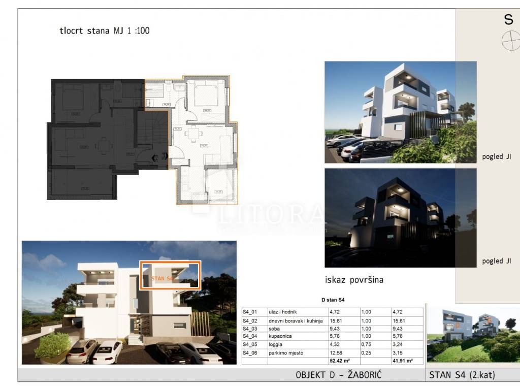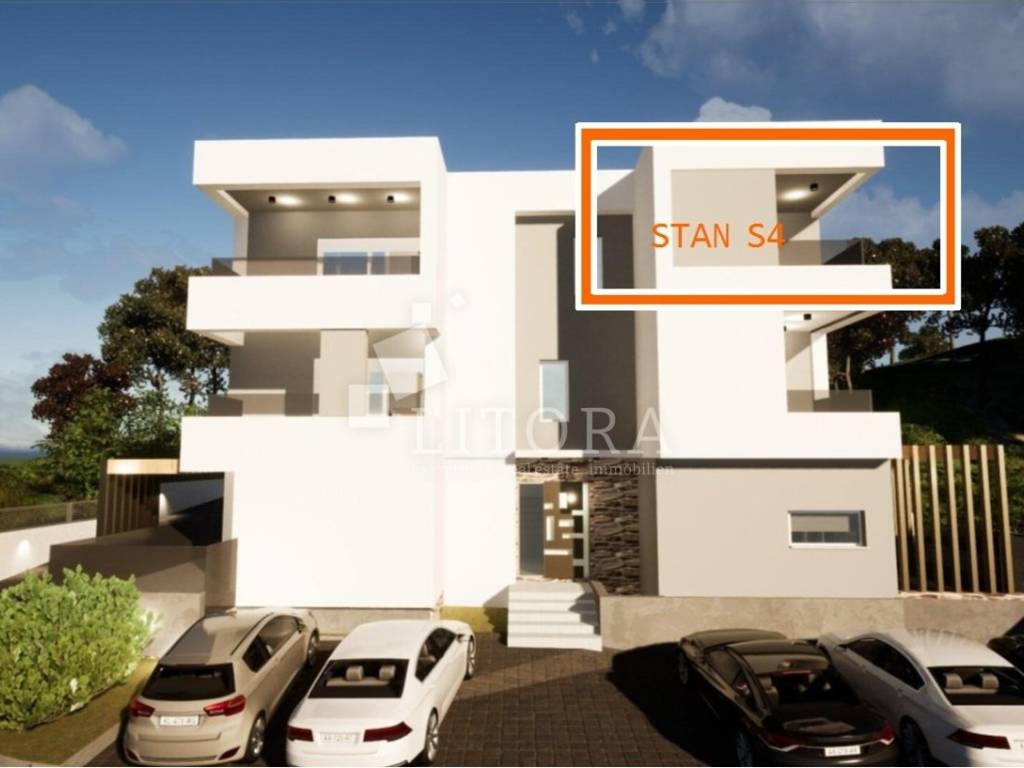 Žaborić – Newly Built Apartment with Sea View, 450m from the beach. This newly built apartment offers 41,91 m² of usable living space and is located on the 2nd floor in a small residential building. It is situated on the south-east side, providing a beautiful sea view. The layout includes a hallway, bathroom, bedroom, and an open-plan living room with a dining area and kitchen, which opens onto an covered terrace of 4,32 m². The apartment is equipped with security doors, air conditioning in each room, electric shutters, and mosquito nets. It also comes with one outdoor parking space. The apartment is located just 450 meters from both the beach and the town center.