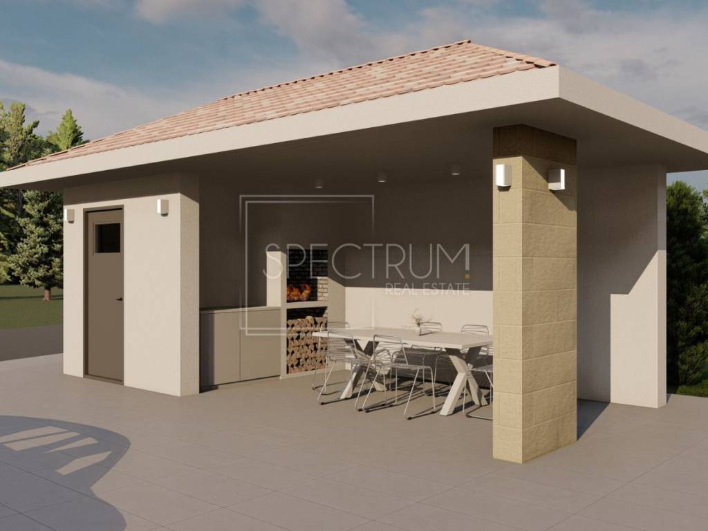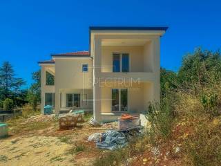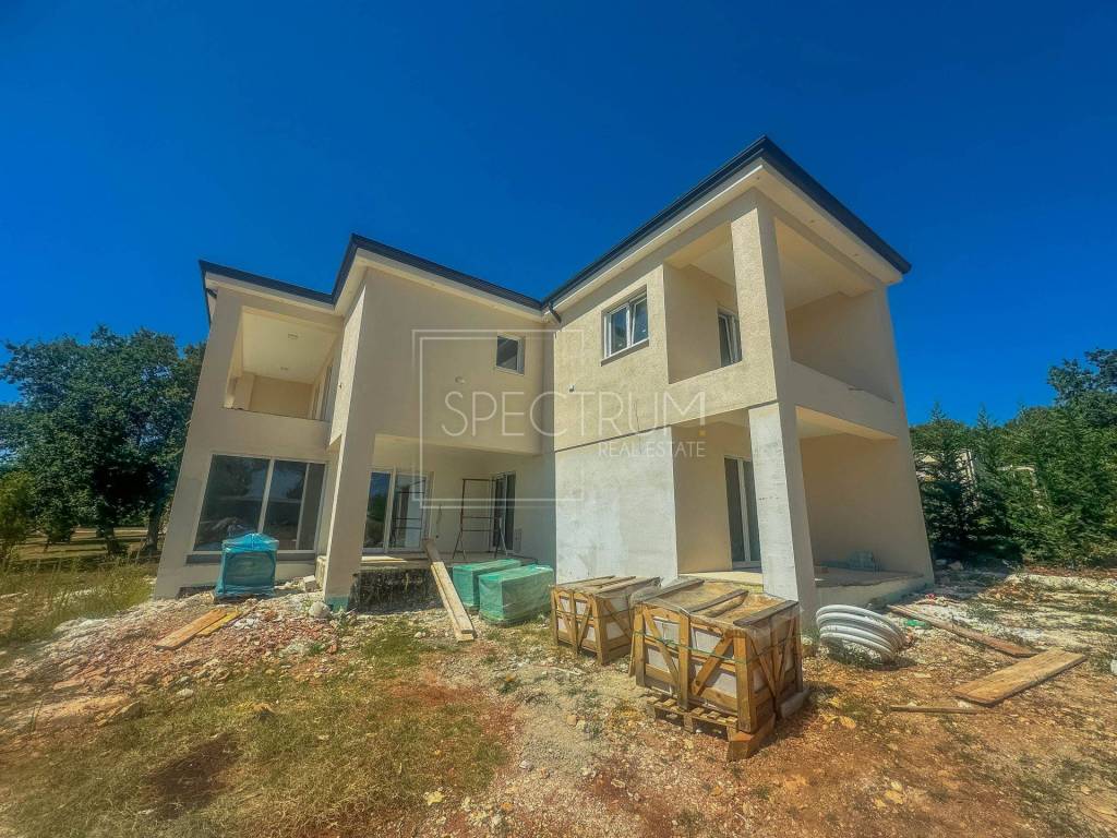 The villa extends through the ground floor and first floor, and the area of the villa is 175.67 m2. On the ground floor there is a spacious living room with kitchen and dining room, bedroom, bathroom, hallway, storage room, technical room and 2 covered terraces. From the living room there is access to the terrace. Stairs lead to the first floor where there is a hallway, 3 bedrooms, each with its own bathroom, storage room and 2 balconies. The villa is heated by underfloor heating with a heat pump, air conditioning in all rooms and solar panels for water heating. Given that the villa also has a chimney, there is also the possibility of installing a stove in the living room. Quality ceramics are placed on the floor of the villa.