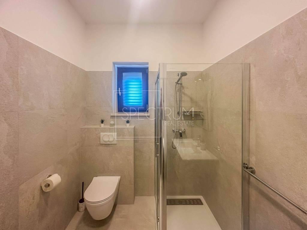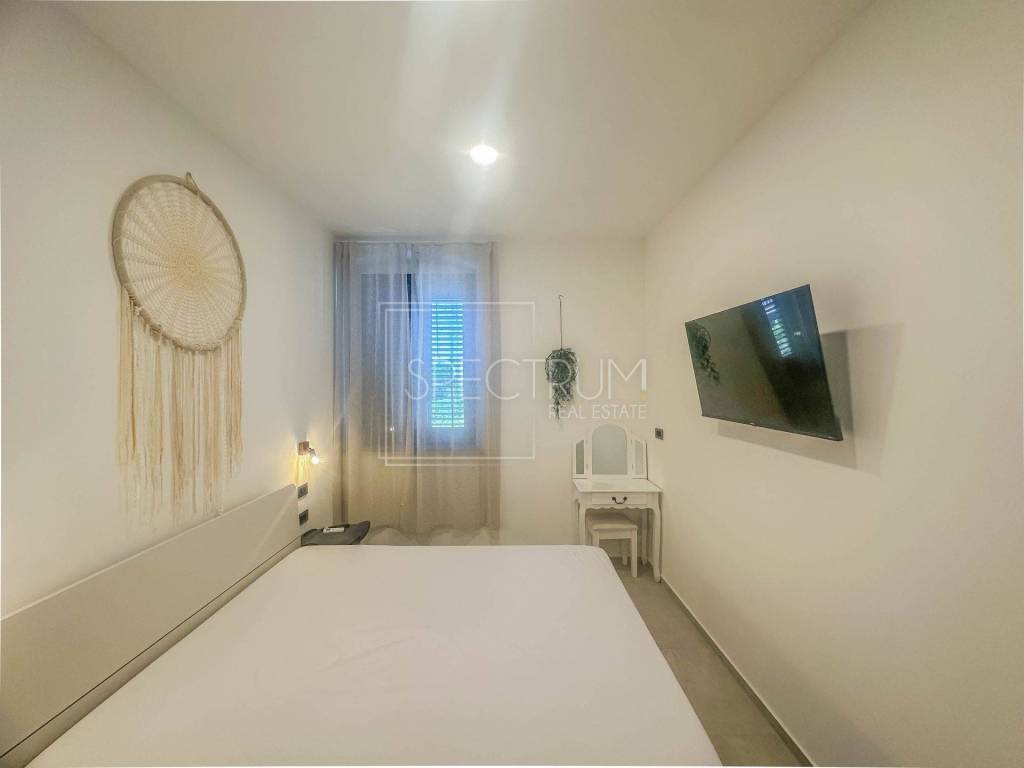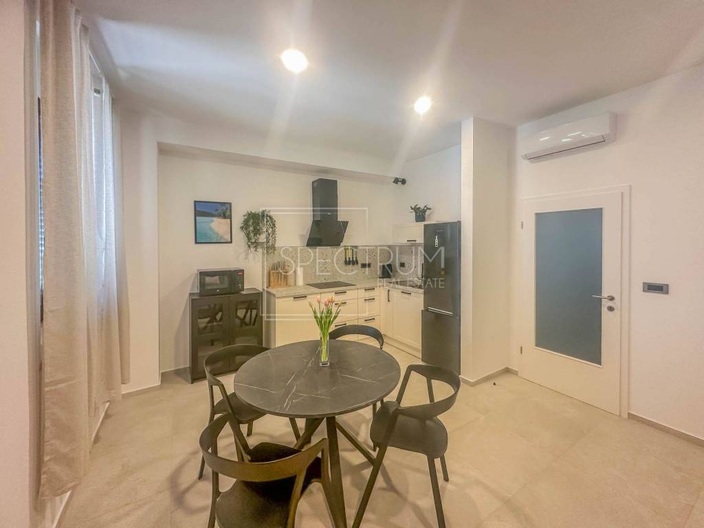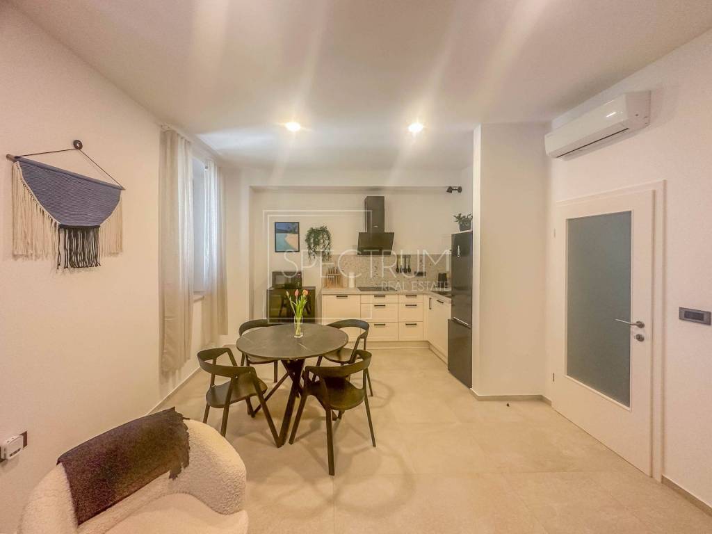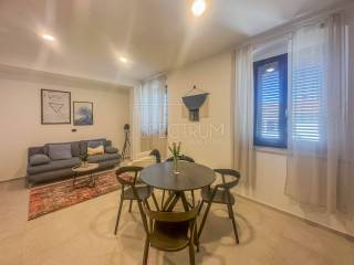 The apartment is located on the 1st floor of a smaller residential building. The area of ​​the apartment is 57.82 m2. The apartment consists of a spacious living room with kitchen and dining room, 2 bedrooms, hallway, bathroom, toilet and laundry room. The apartment offers a view of the sea. The apartment is heated by air conditioning, underfloor heating in the bathroom, and there is also the possibility of installing a wood stove. The apartment was completely renovated last year. The apartment is for sale fully equipped and furnished.