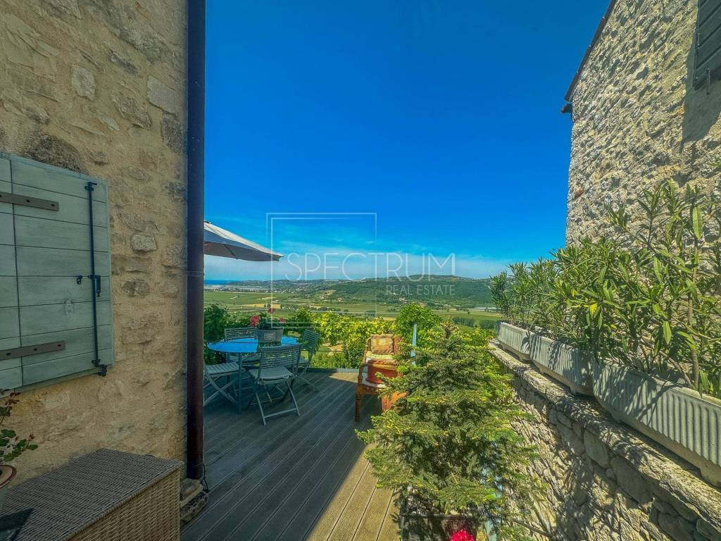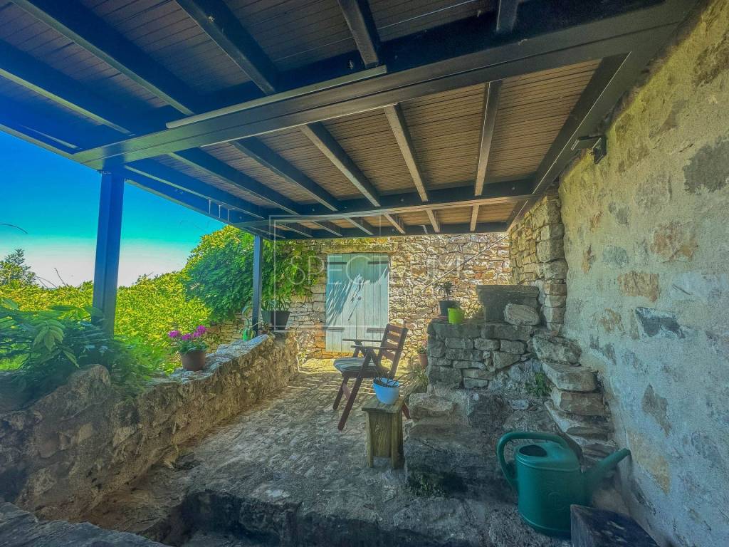 The ground floor of the house leads directly to the terrace, which offers a beautiful panoramic view of the sea and the beautiful Istrian landscape. The terrace is ideal for enjoying the view and spending time outdoors. From the terrace, stairs descend to another lower covered terrace, which is accessed from the lower floor. Near the lower floor there is another room that can be used as a storage room.