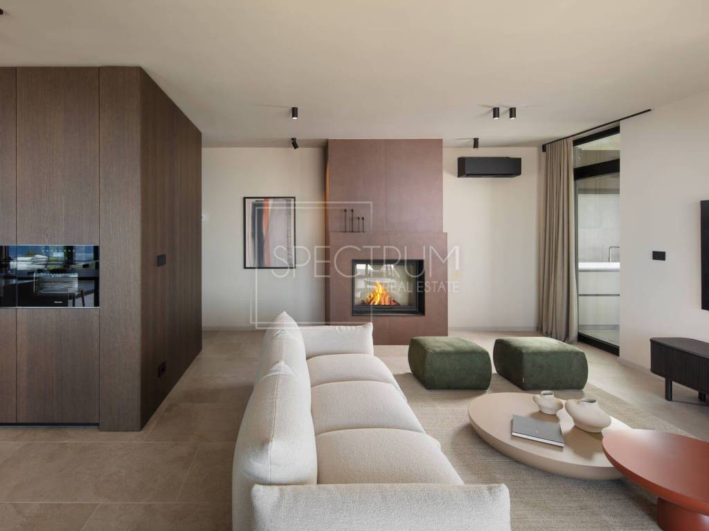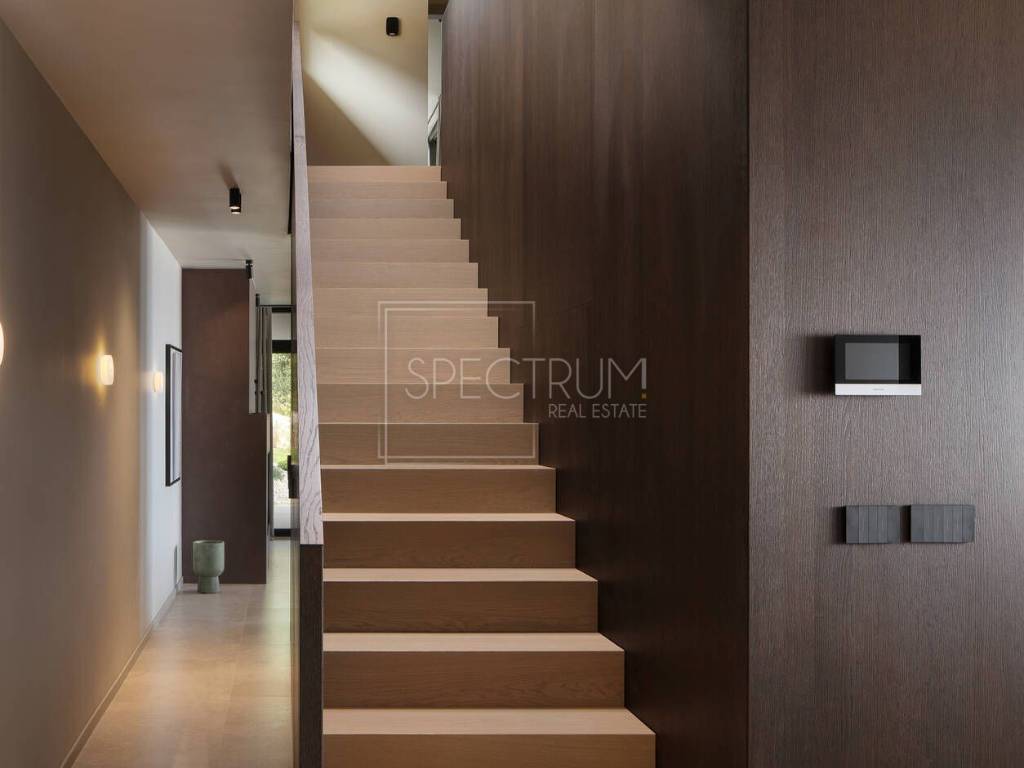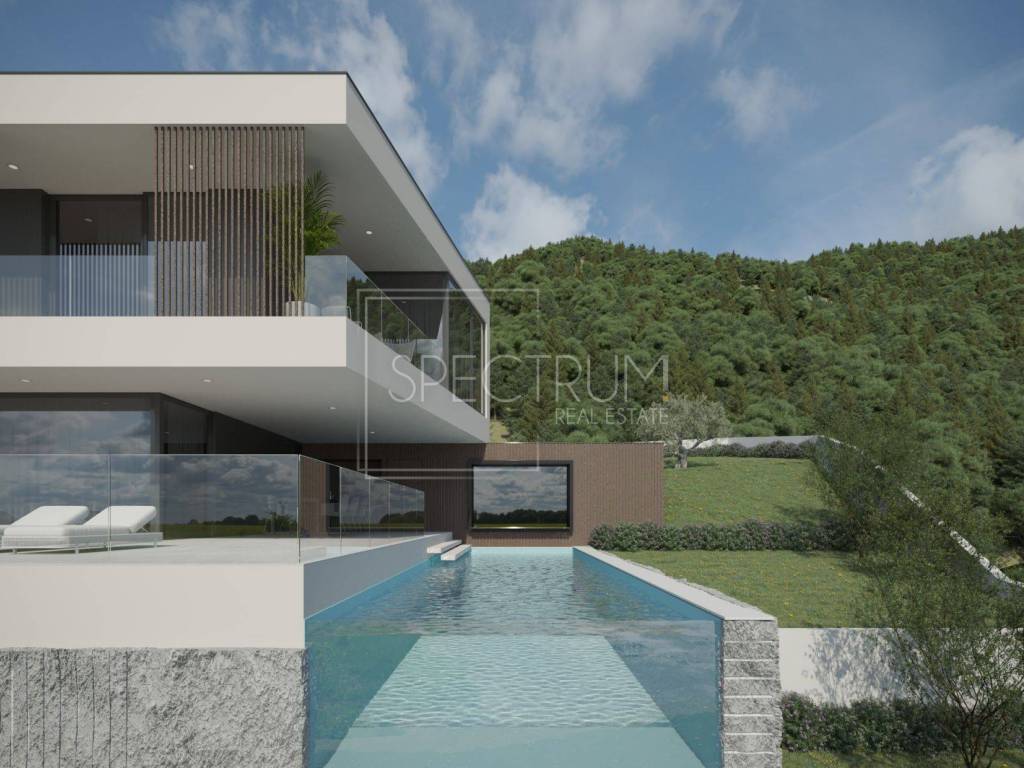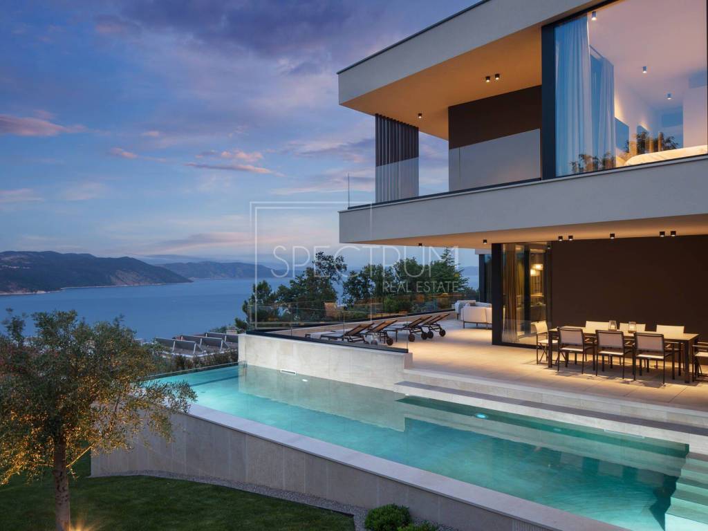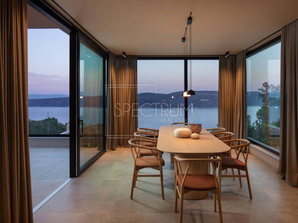 The villa extends through the ground floor and first floor, and the net area of ​​the house is 245.95 m2. On the ground floor there is an open space living room with kitchen and dining room, entrance hall, toilet and wellness room. The ground floor leads to a covered terrace, ideal for enjoying the outdoors, with a beautiful and open view of the sea and the island of Cres. From the terrace on the ground floor you can reach the sunbathing area and the spacious swimming pool of 39.10 m2. There is also a view of the sea from the pool. Internal stairs lead to the first floor where there is a hallway, laundry room and 4 bedrooms, each with its own bathroom. Each room leads to another spacious terrace with a unique view. The villa is sold fully furnished. The villa is heated by floor heating on a heat pump installed throughout the villa and by air conditioning. The villa is characterized by luxurious and modern architecture and unique design. Due to the large glass walls, this villa always has enough sunlight.