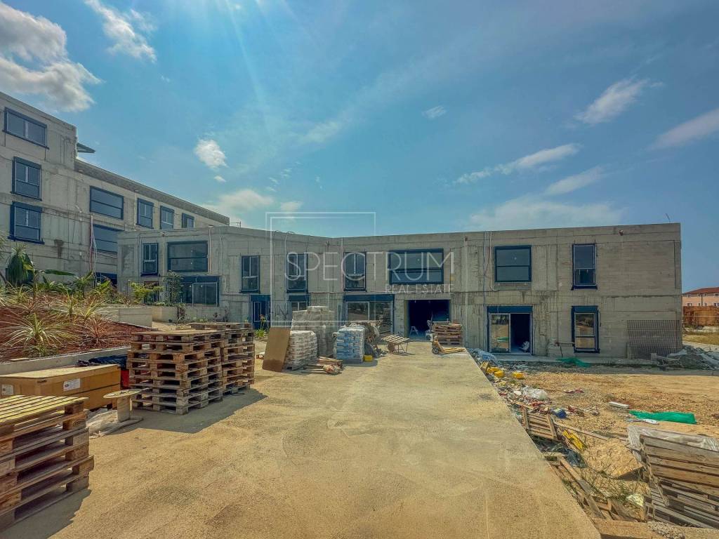 The apartment is located on the ground floor of a newly built residential and commercial complex, which consists of the central, southern and northern parts. The area of ​​the apartment is 79.91 m2. The apartment is sold on a "turnkey" basis with a fully equipped bathroom (furniture and sanitary ware), floor coverings in all rooms (class 1 ceramic, laminate), installed electrical installations, built-in air conditioning, interior carpentry, exterior PVC or ALU carpentry, burglar-proof and fire-proof entrance doors, antenna system, UTP network, and white walls and ceilings.