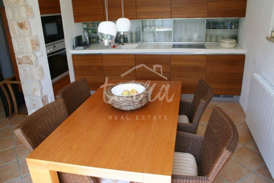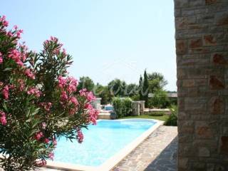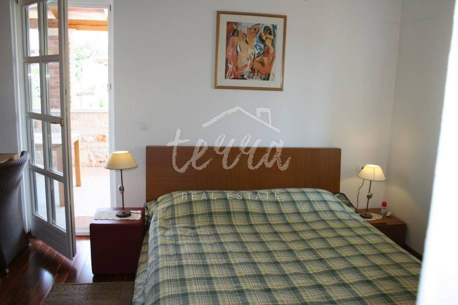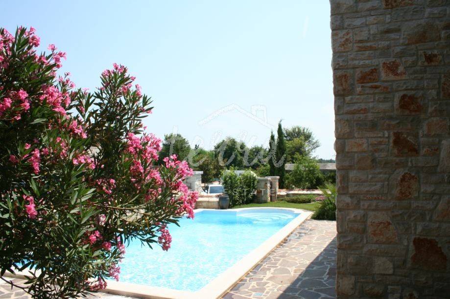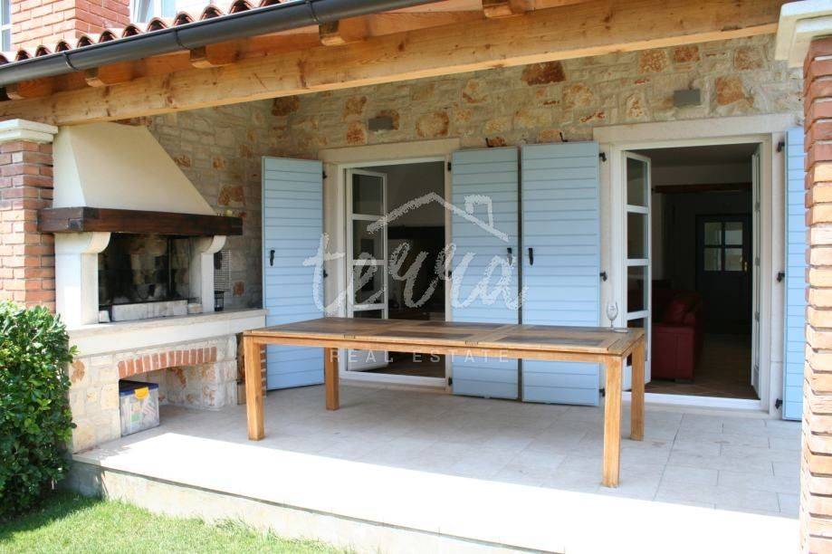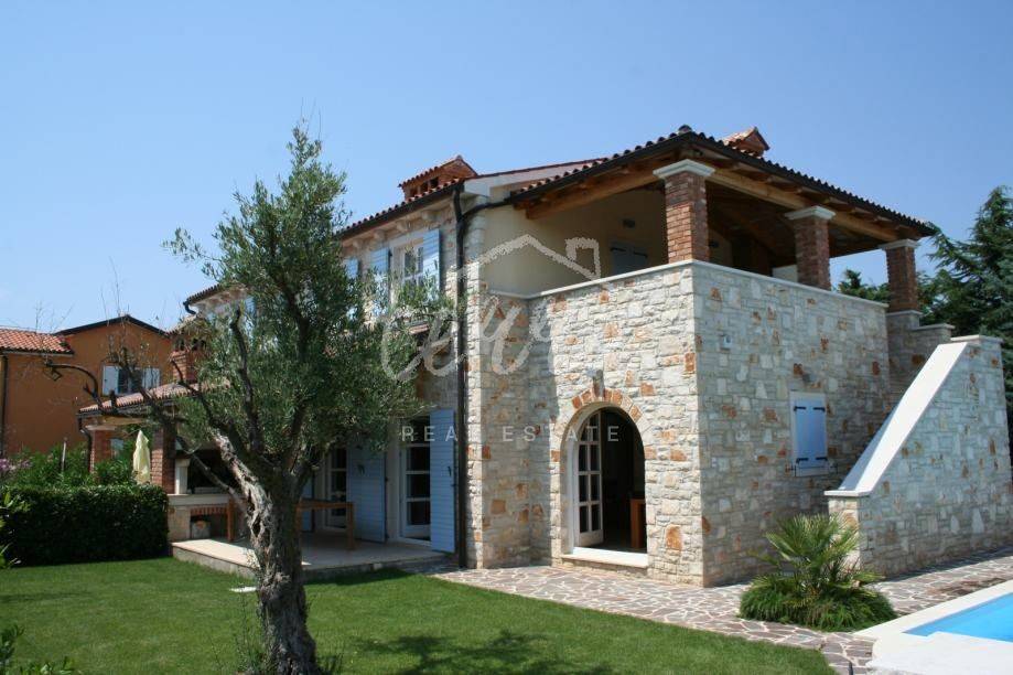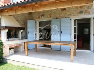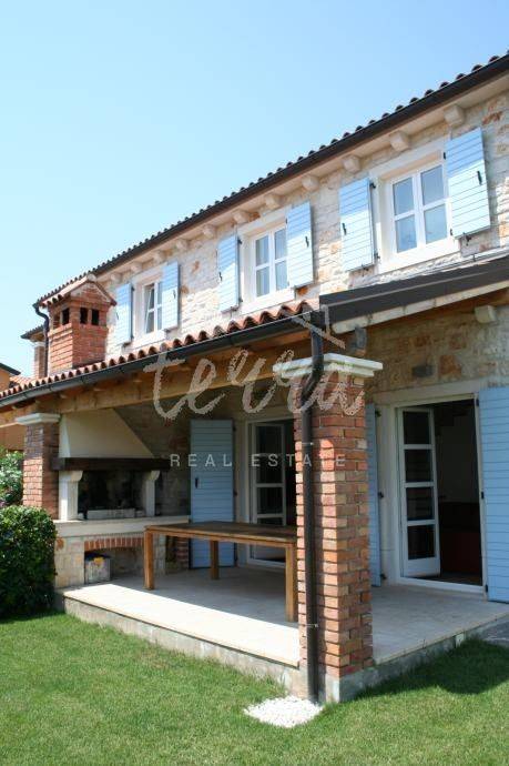 This beautiful house is built in an old Istrian style stone Villa. It is located in a quiet village, surrounded by greenery. On the ground floor next to the entrance hall there is an open-plan living room, kitchen and dining room, bedroom, bathroom and storage room. From the living room and dining room there is an exit to a spacious covered terrace of 36m2 (summer kitchen and barbecue), landscaped lawn and swimming pool measuring 4x8m surrounded by a low stone wall and greenery and a sauna. On the first floor, which can be reached by internal stairs as well as external stone staircase roof a large covered terrace there are two bedrooms that have direct access to the terrace, two large bathrooms and a dressing room. The outdoor area is perfect for socializing and enjoying the beautiful weather. This property is an ideal investment in tourism, close to the city of Porec with all tourist facilities, close to the sea and the border with Slovenia.