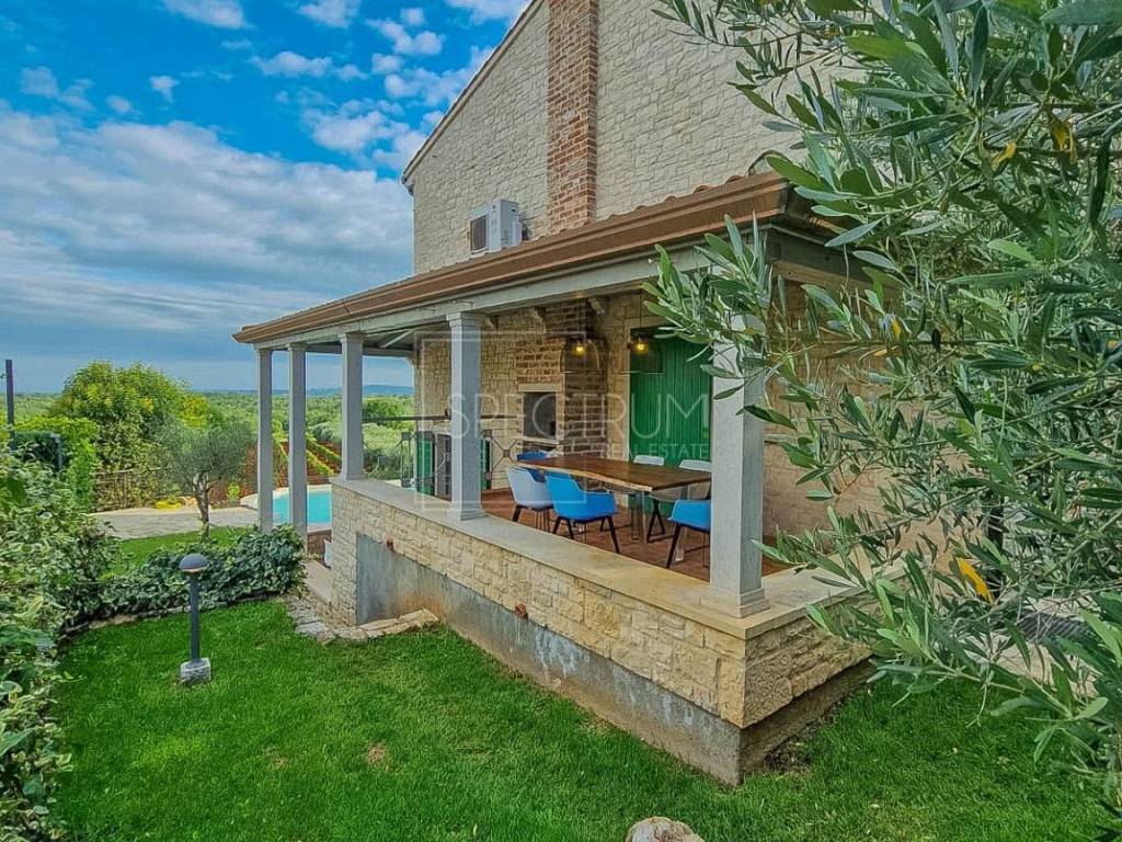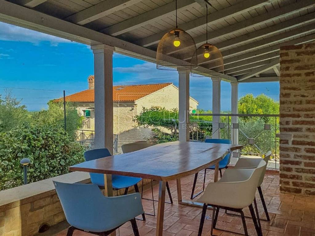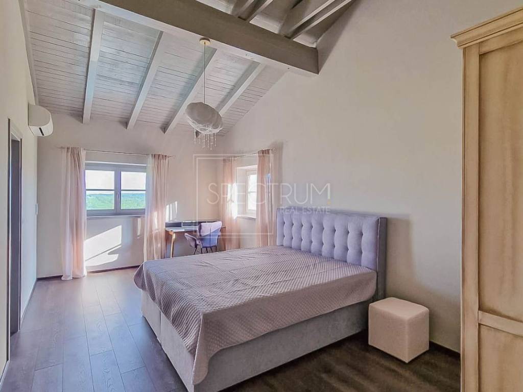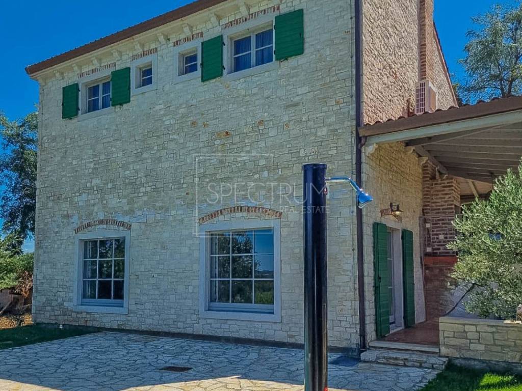 The villa extends over the ground floor and the first floor, and the villa's area is 177 m2. The ground floor has an entrance hall, a spacious living room, a kitchen with a dining room and access to a covered terrace with an outdoor stone barbecue, a bedroom and a storage room. The covered terrace is an ideal space for enjoyment. Internal stairs lead to the first floor where there is a hallway, 2 larger bedrooms with private bathrooms, and 2 smaller children's bedrooms and a bathroom. Heating is via a fireplace in the living room and air conditioning. The house offers a beautiful open view of the sea and the beautiful Istrian landscape.