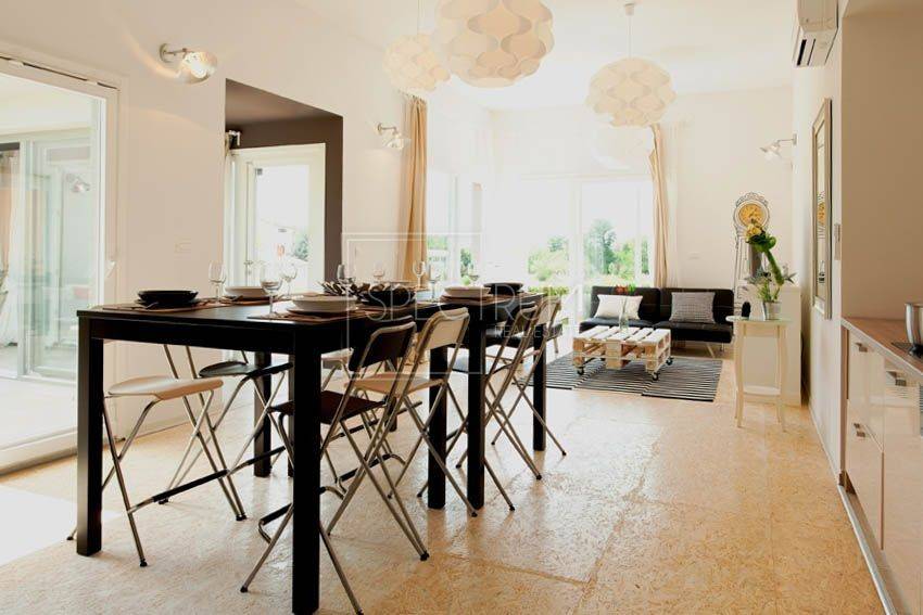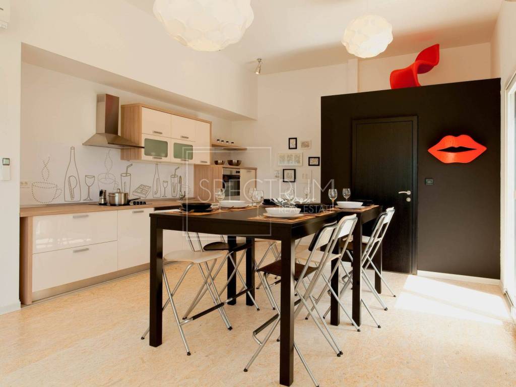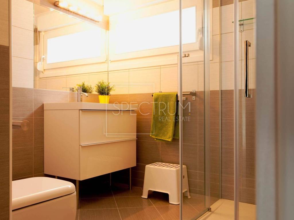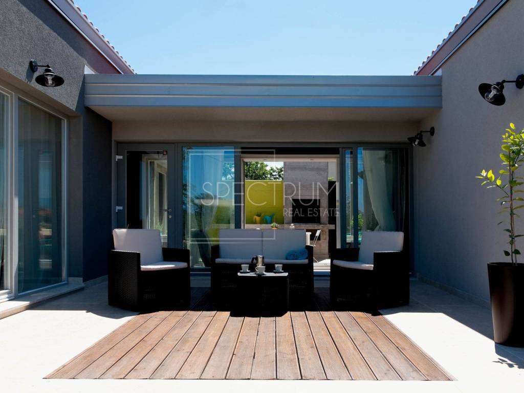 The area of ​​the house is 147 m2. The house has a unique architectural design, and its floor plan is designed in the shape of the letter H, with separate living and sleeping areas. The living area consists of a living room with an open-space kitchen and dining area and a toilet, and a hallway connecting both parts of the house leads to the sleeping area of ​​the house where there are 3 bedrooms and 2 bathrooms. The layout of the rooms is very good, the living area is used to the maximum, and due to the high ceilings and large glass walls, the house is extremely spacious, full of light and gives the impression of openness. The house leads to a terrace, and from the terrace you can reach the swimming pool with a sunbathing area, which makes an ideal space for enjoying the warm summer months. Next to the pool there is a landscaped yard filled with greenery. In the back of the landscaped and fenced garden there is a summer kitchen with a barbecue. The house is heated by central heating with a heat pump and air conditioning. The house is being sold furnished.