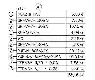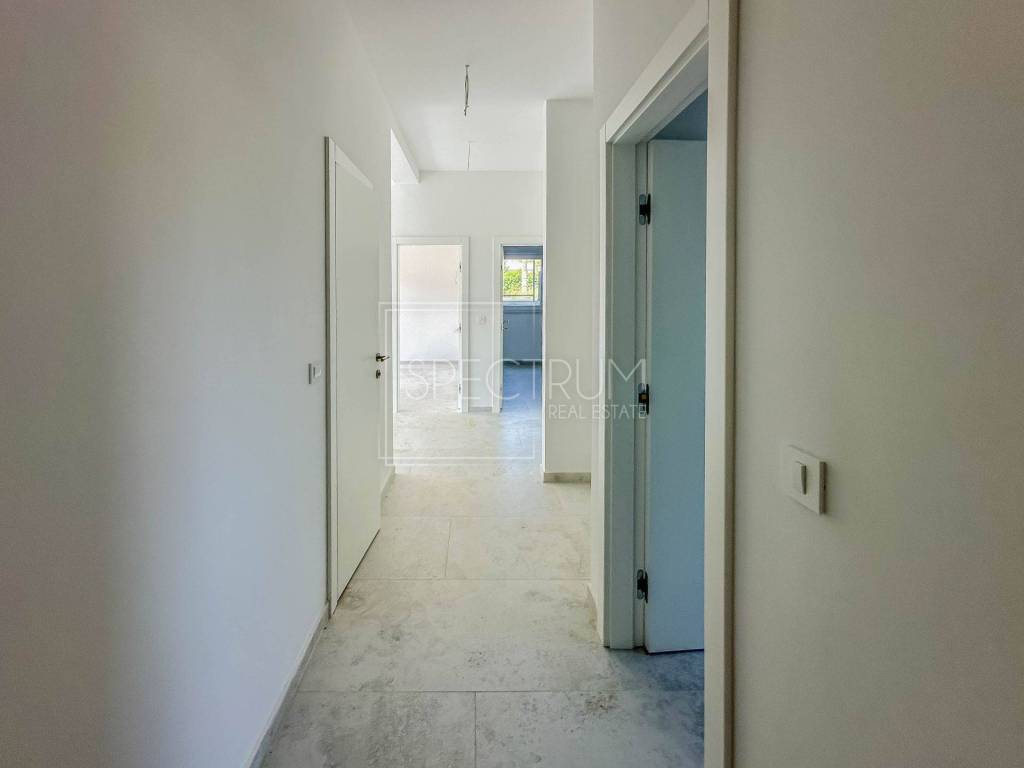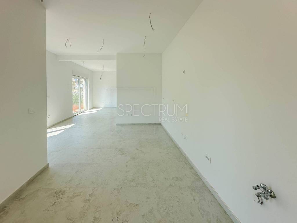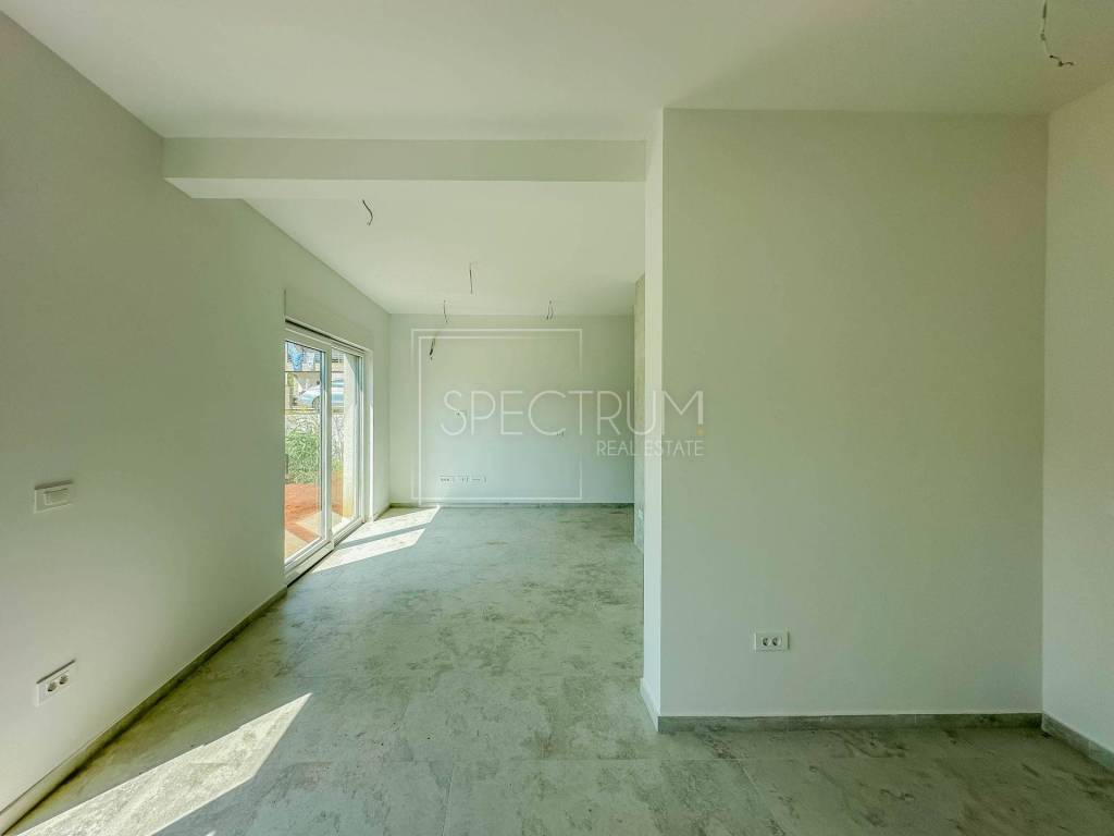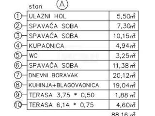 The apartment is located on the ground floor of a newly built residential building with 11 residential units. The apartment has an area of ​​88.16 m2. The apartment consists of a living room with an open space kitchen and dining room, 3 bedrooms, a bathroom, a toilet, a hallway and 2 covered terraces. One terrace is accessed from the kitchen, and the other from the bedroom. The terraces lead to a fenced garden of 80 m2.