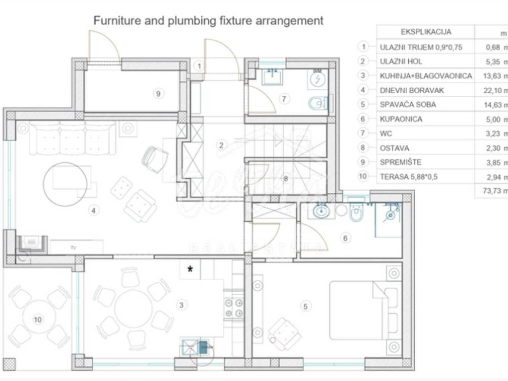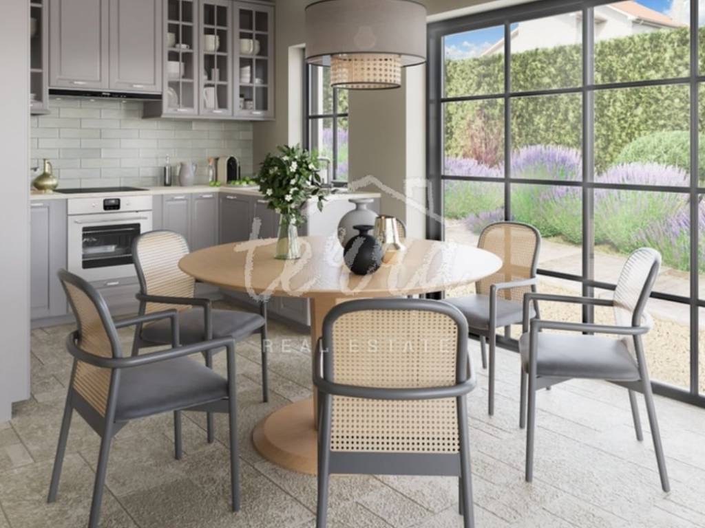 Layout of the villas: on the ground floor there is a spacious living room, kitchen and dining room, bedroom with bathroom, pantry, storage room and toilet, as well as access to the terrace and pool.