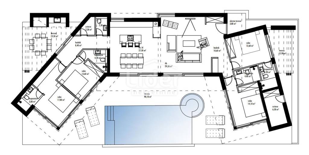 Schüco joinery ensures optimal light and ventilation, while the spacious living room invites you to relax with an incredible view of the endless blue of the sea. The infinity heated swimming pool provides a feeling of luxury and privacy, while the underfloor heating of the entire house ensures pleasant warmth in all rooms.