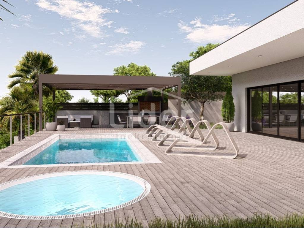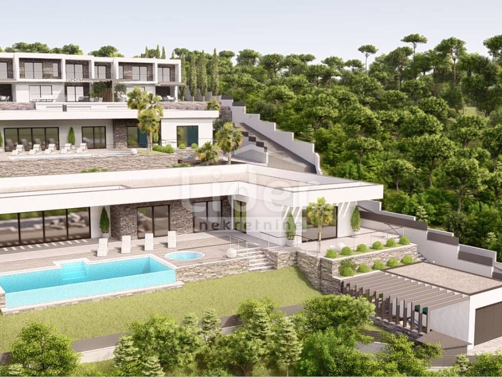The living area on the ground level consists of an open space with living room, kitchen and dining room, a separate toilet and a laundry room. On the first level there are three spacious bedrooms, each of which has its own bathroom and loggia. From ground level there is a direct access to the 750 m2 garden with a 22 m2 swimming pool, a sunbathing area and a 200 m2 covered terrace with a barbecue and summer kitchen. A true little paradise for lovers of outdoor living with a beautiful view of the sea and the the surrounding nature.