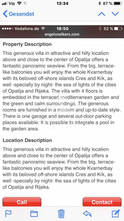 For sale we have a house with three residential units in a unique location in Opatija with fantastic views of the whole Kvarner, 350 meters from the sea. Only the top floor is decorated, the other residential units are tiled or in the high stage of roh bau. The house consists of: - Basement: garage - Ground floor: unfurnished apartment in roh bau phase - 1st floor: two bedroom unfurnished apartment - 2nd floor: attic - fully furnished duplex apartment The house has a beautiful open view of the whole Kvarner, large terraces, garage and the possibility of constructing a swimming pool and an additional 2 garages and is located in a quiet location. General notes: Viewing the real estate is possible only with the signed intermediary contract, which is the basis for further actions related to the sale and payment of commission, all in accordance with the Law on Real Estate Brokerage. REAL ESTATE PREMIUM Agency as an Authorized Real Estate Broker for Mediation Services at the Time of Concluding a Contract or Contract: - Purchases from the BUYER and the SELLER an intermediary fee in the amount of 3%+ VAT of the CONTRACTED BUYING PRICE - on the LEASE from the LESSEE and from the LESSEE charges one agreed monthly rent At each viewing of the property the potential buyer / lessee is obliged to sign the Brokerage Agreement