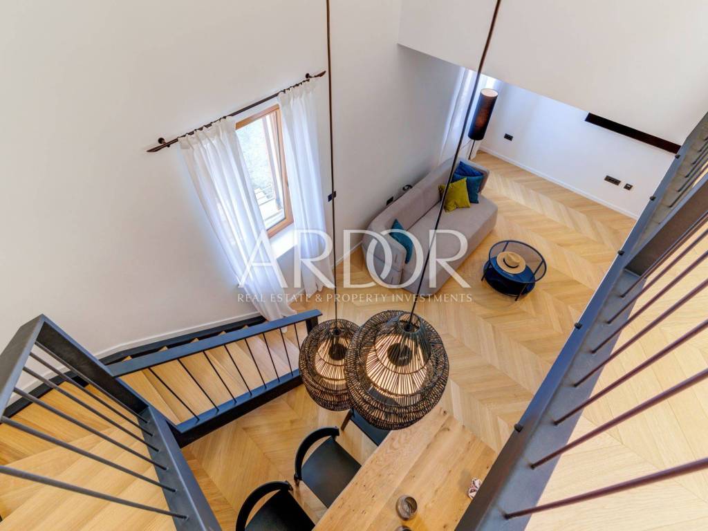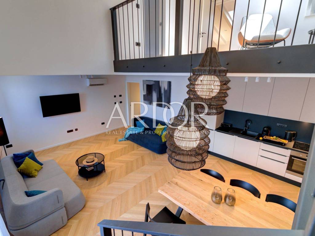 This duplex apartment is located on the 2nd floor and in the high attic, with a total living area of 133 m². It consists of an entrance hall, a spacious living room, a dining room and a fully equipped open-concept kitchen, one bedroom and a bathroom on the lower floor. On the upper floor there are two additional bedrooms and a spacious bathroom.