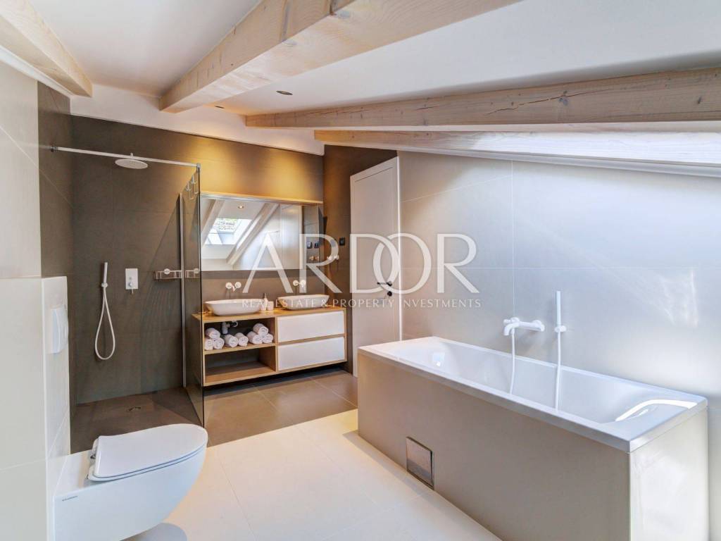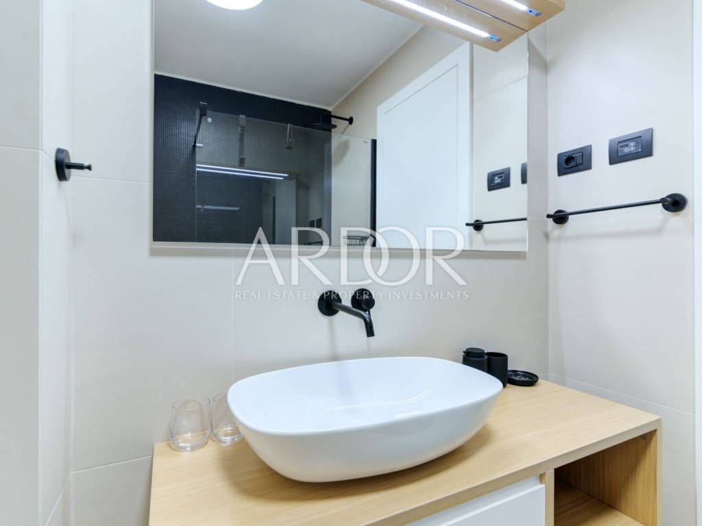 The landscaped garden behind the building provides additional privacy and peace, and each apartment has its own part of the landscaped garden with a private terrace. At the very top there is a swimming pool with a sunbathing area, perfect for relaxing with panoramic sea views.