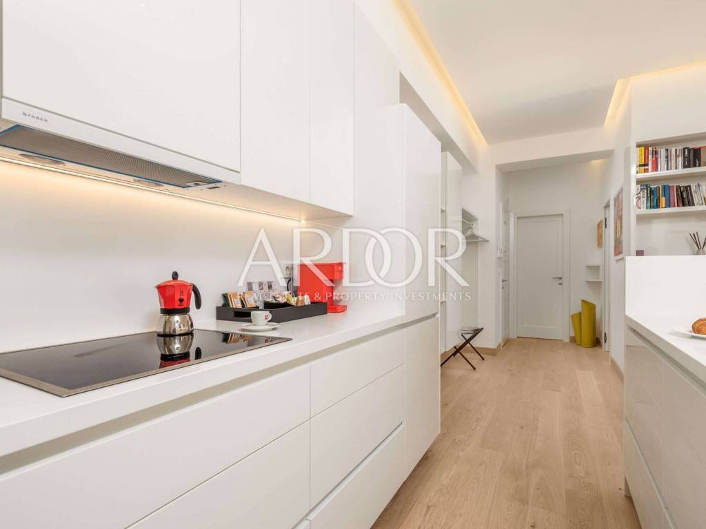 It is equipped with high-quality materials such as Hain oak parquet, Villeroy & Boch sanitary ware, Daikin fan coils, all kitchen appliances are Bosch, and the furniture is Artisan and Natuzzi. Heating and cooling is provided by fan coils in all rooms and underfloor heating in the bathrooms. It is sold fully furnished.