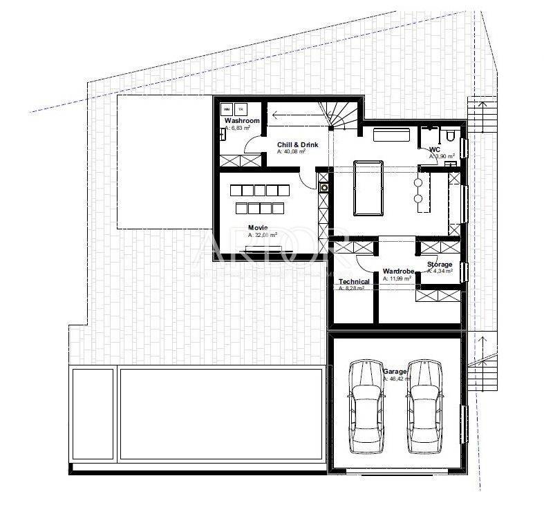 An additional special feature is the spacious basement area in which there is a tavern, a games room with a cinema, a utility and technical room, a storage room and a garage of 46 m2 for 2 cars.