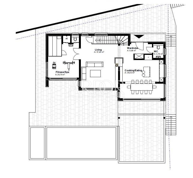 The interior area of ​​335 m2, spreads over three floors and consists of 4 bedrooms, all with private bathrooms and walk-in closets, a living room with kitchen and dining room, a wellness room with sauna and jacuzzi and a spacious terrace with an infinity pool of 50 m2.