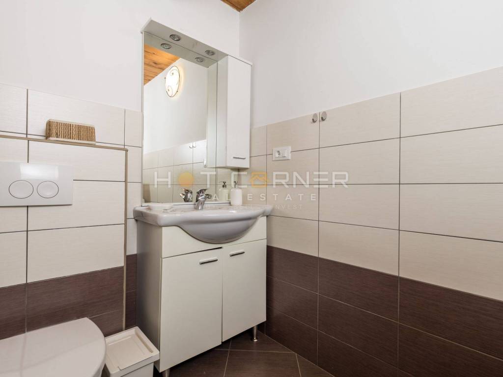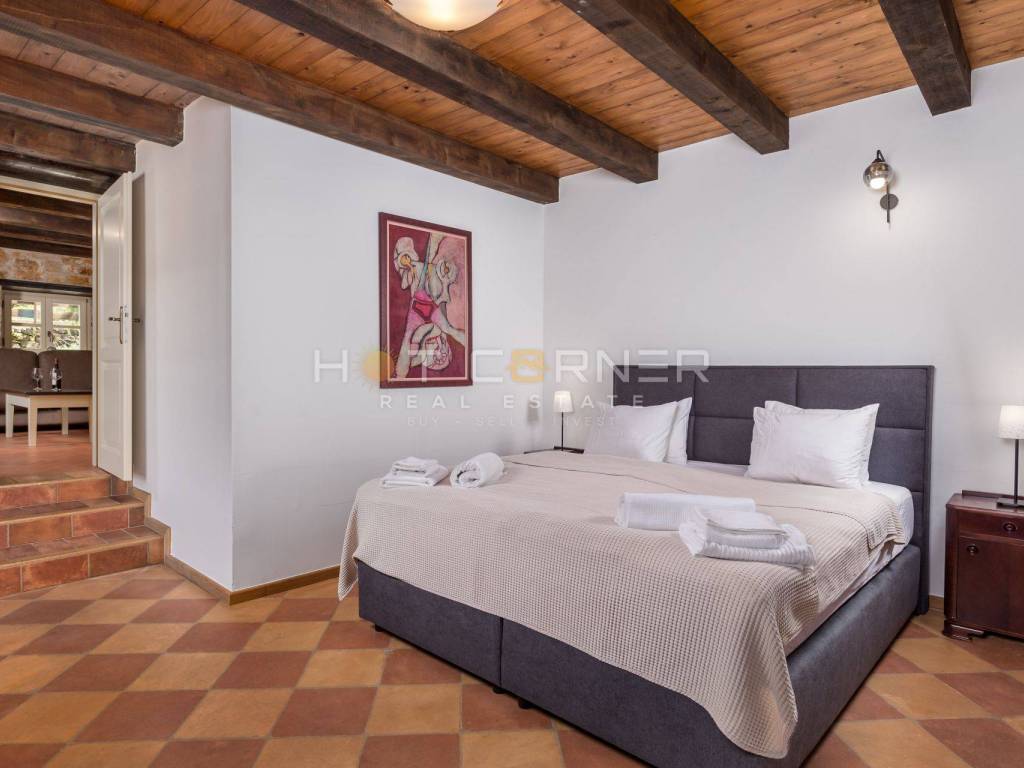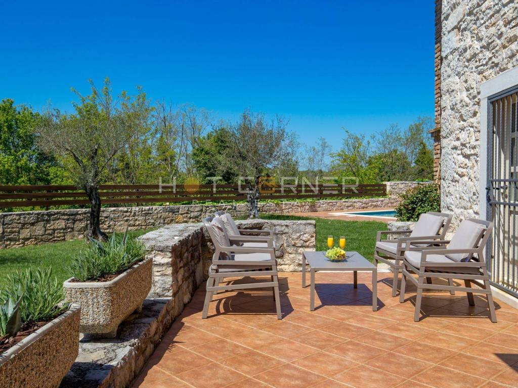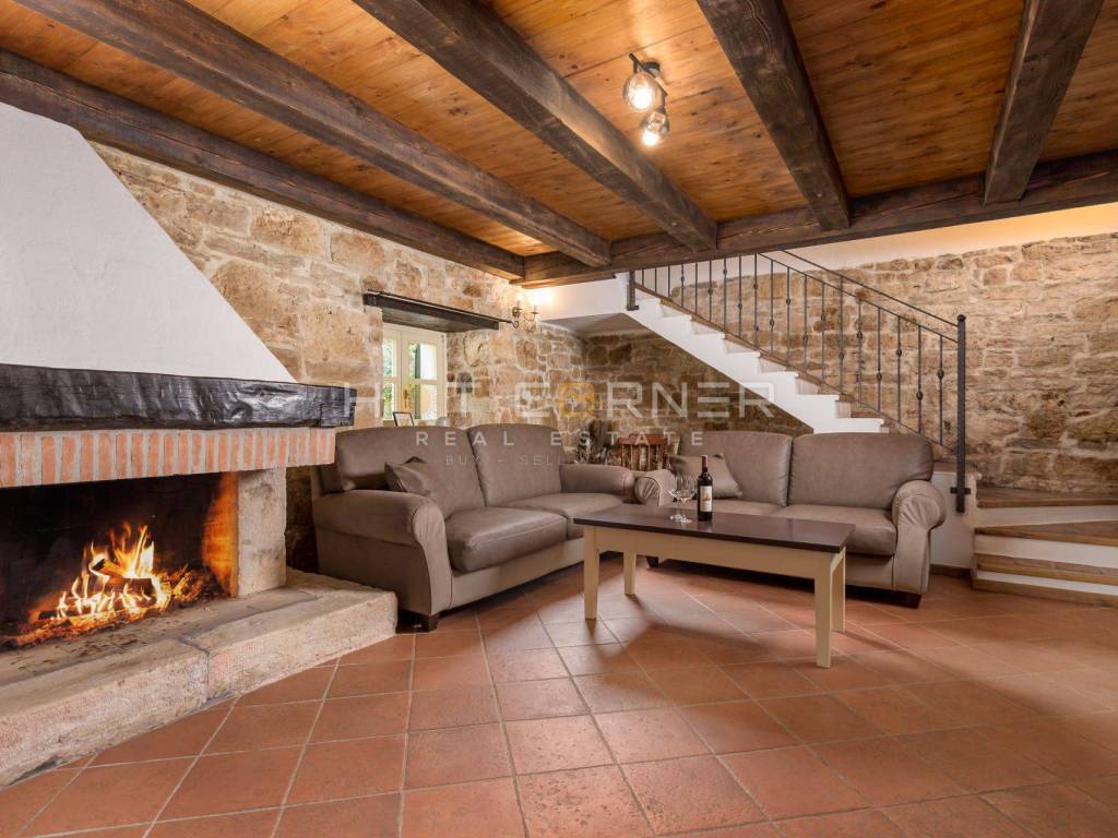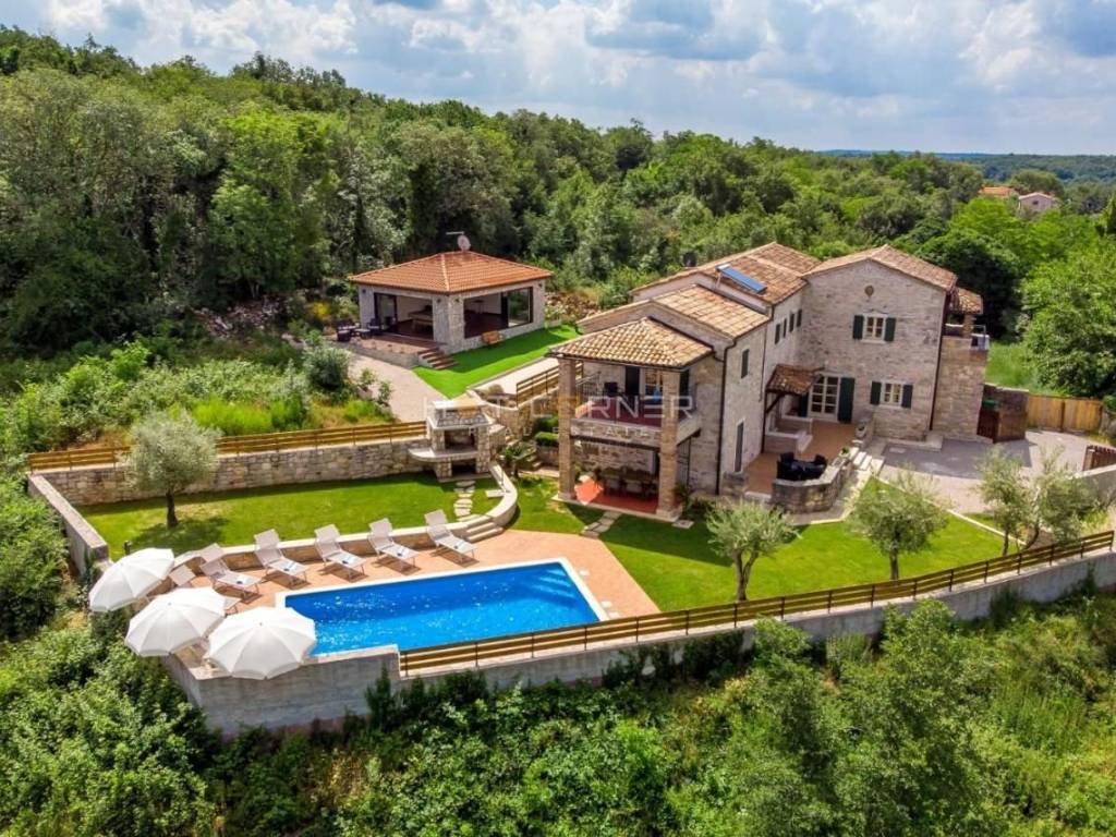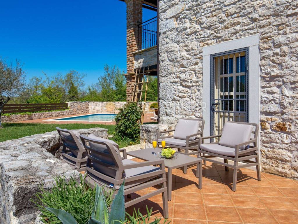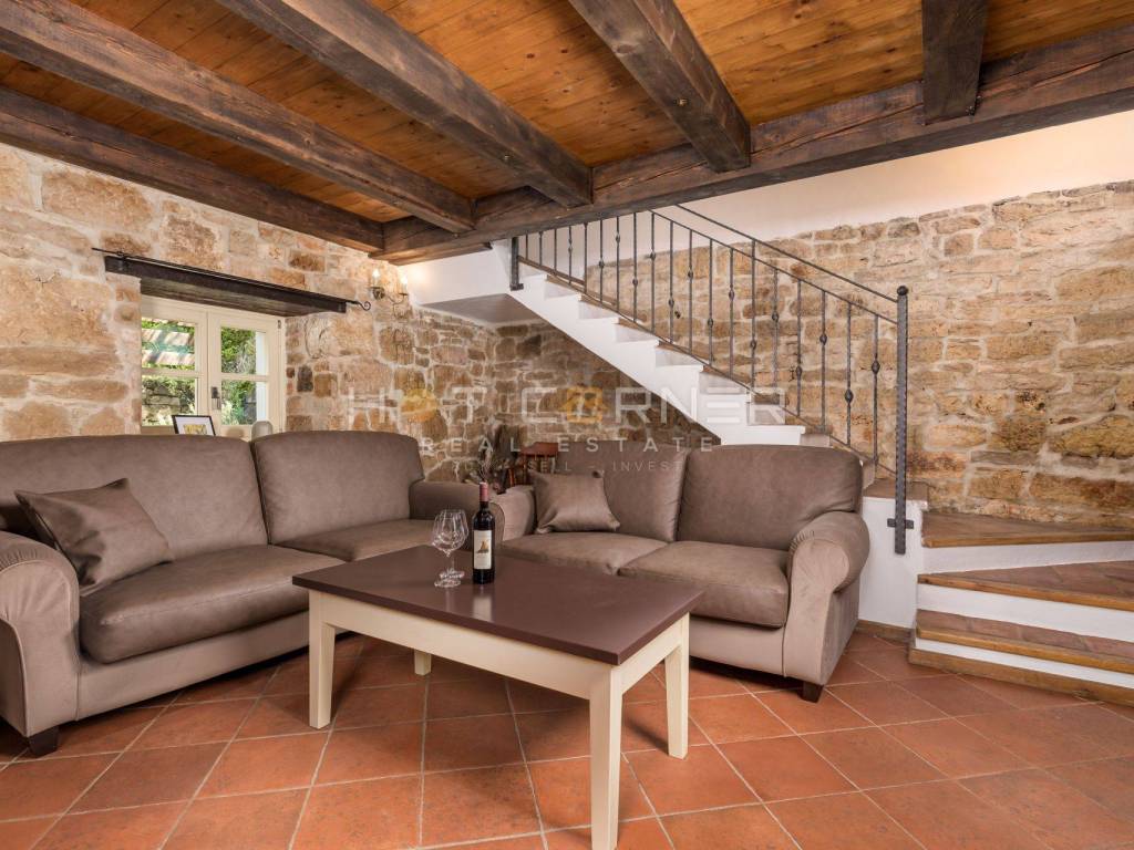On the ground floor of the villa, the central place is occupied by a spacious living room with an open fireplace, decorated in elegant brown tones. Wooden beams on the ceilings and stone on the walls continue from the living room into the dining room and spacious kitchen. Large glass doors lead to the terrace, which is surrounded by a meticulously landscaped garden. On the terrace there is a lounge area surrounded by fragrant herbs, a summer kitchen with a dining table and a swimming pool surrounded by a sunbathing area. In the decoration of the outdoor space, the emphasis was placed on the Istrian tradition, stone was used to fence the garden, while wooden beams were used in the canopy. The villa has three bedrooms, each with its own bathroom. One bedroom is located on the ground floor, as well as a toilet. Internal stairs lead to the first floor where there are 2 bedrooms that have access to spacious covered terraces. The terraces offer a panoramic view of untouched nature and the sea.