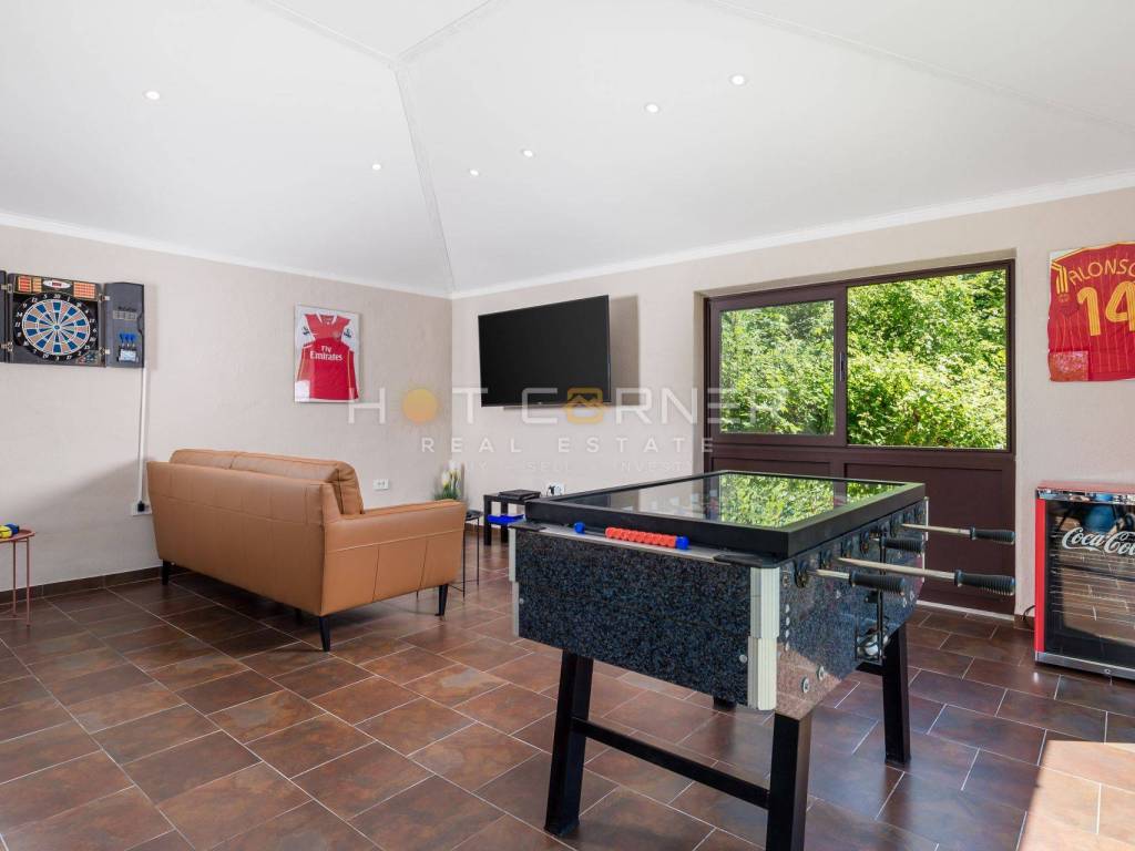 A great addition to the entire contents of the villa is a separate air-conditioned house in which there is a space for socializing and entertainment, in which there is a pool table, a table for table tennis and a lounge area with a TV. It is possible to park several cars in the garden.