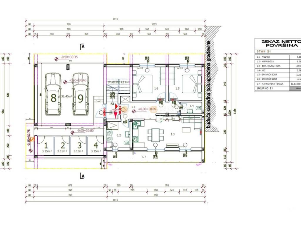 Apartment S1 consists of a living room with kitchen and dining room (22.55m2), hallway (9.35m2), 2 bedrooms (11.56m2 and 11.56m2), bathroom (6.56m2), separate toilet (2.58m2 ) and covered terraces (10.57m2x0.5, reduced area 5.25m2). Total 69.41m2 (S1). The apartment also includes 2 outdoor parking spaces of 12.50 m2 each (reduced area 3.13 m2), a storage room on the ground floor of the building with an area of 3.15 m2 (reduced area 1.58 m2).
