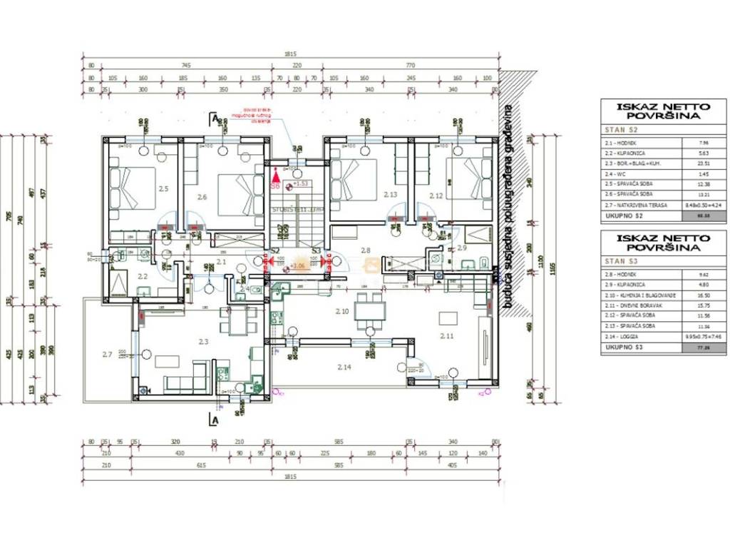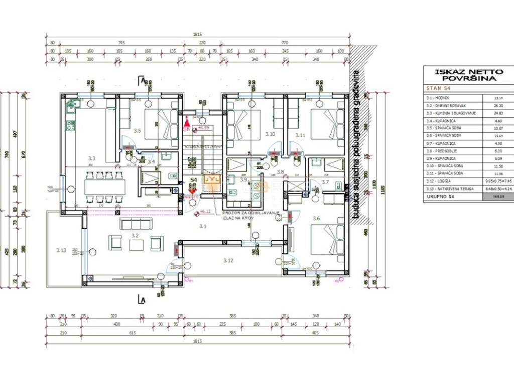 Apartment S4 consists of a living room (26.20m2), kitchen and dining room (24.83m2), hallway (13.14m2), 4 bedrooms, 3 of which have an attached bathroom (10.67m2+4.40m2; 15.64m2 +4.30m2; 11.56m2+6.09m2; 11.56m2), loggia (9.95m2x0.75, reduced area 7.46m2), and covered terrace (8.48m2x0.5=4.24m2). Total 146.39m2 (S3). The apartment has a garage with an area of 36.40m2 (reduced area 18.20m2), and 1 outdoor parking space 12.50m2 (reduced area 3.13m2), a storage room on the ground floor of the building with an area of 3.15m2 (reduced area 1.58m2).