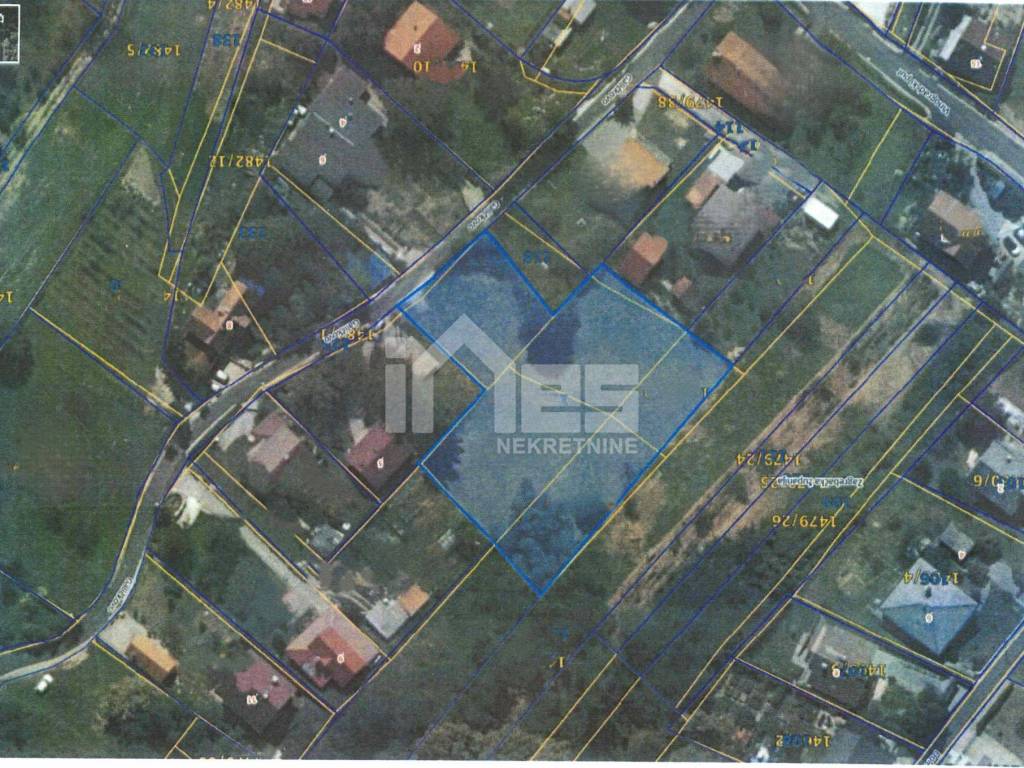 VAŽNO !!! - Novom državnom geodetskom izmjerom navedene čestice pripojene su u jednu te imaju površinu od 2540m2. Dužina parcele regulacijskom crtom gornje strane zemljišta iznosi 60,24m dok ulazni dio s ceste iznosi cca 22m, bočna regulacijska crta iznosi 59m.