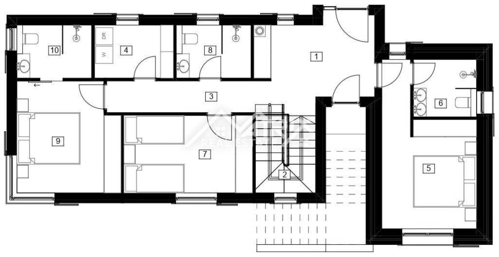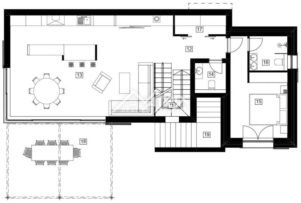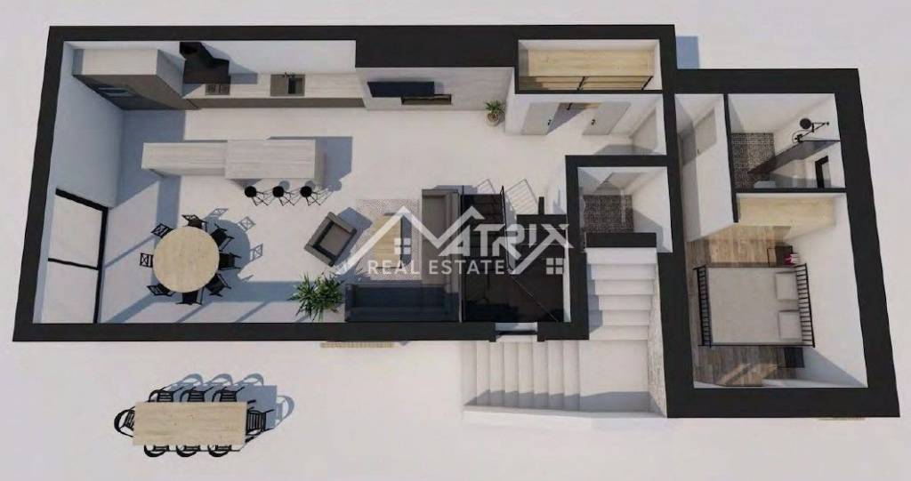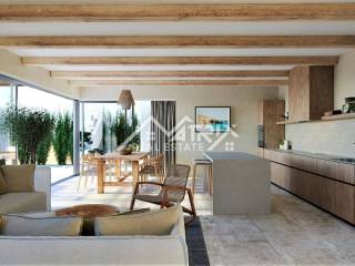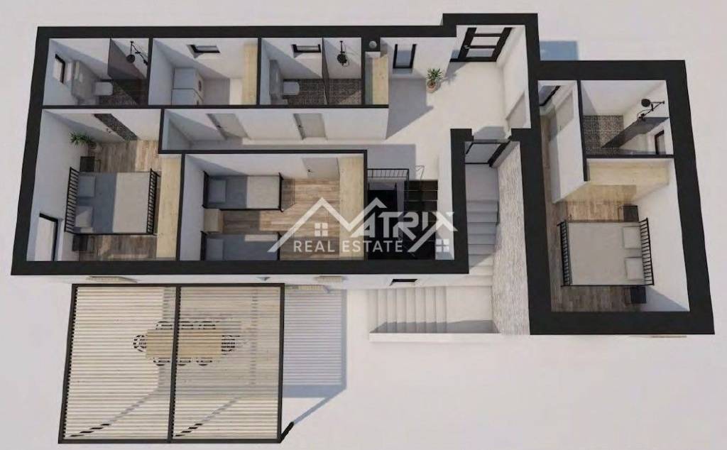 The house is spread over two floors, ground floor and upper floor. The main entrance to the villa is on the upper floor where there are three bedrooms, three bathrooms, a storage room, and a laundry room. The house has an internal and external staircase. An external staircase directly connects it to the pool terrace, while an internal staircase leads to the ground floor of this villa, where there is an open space that unites the living room with the dining room and kitchen, one bedroom with its own bathroom, a storage room, and a toilet. From this part, through large glass walls, you can exit to the pool terrace where there is also an outdoor dining room covered with a beautiful pergola.