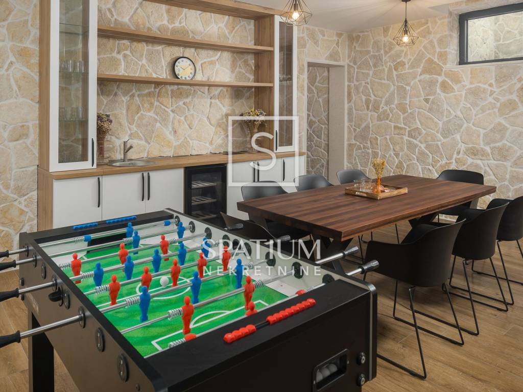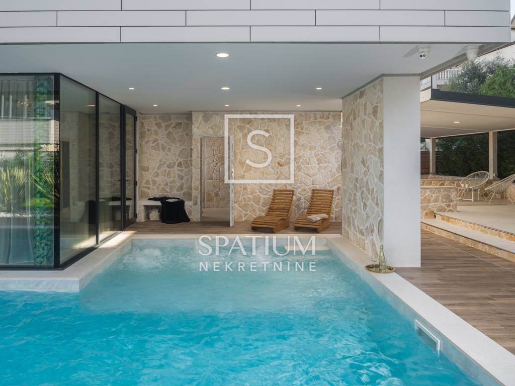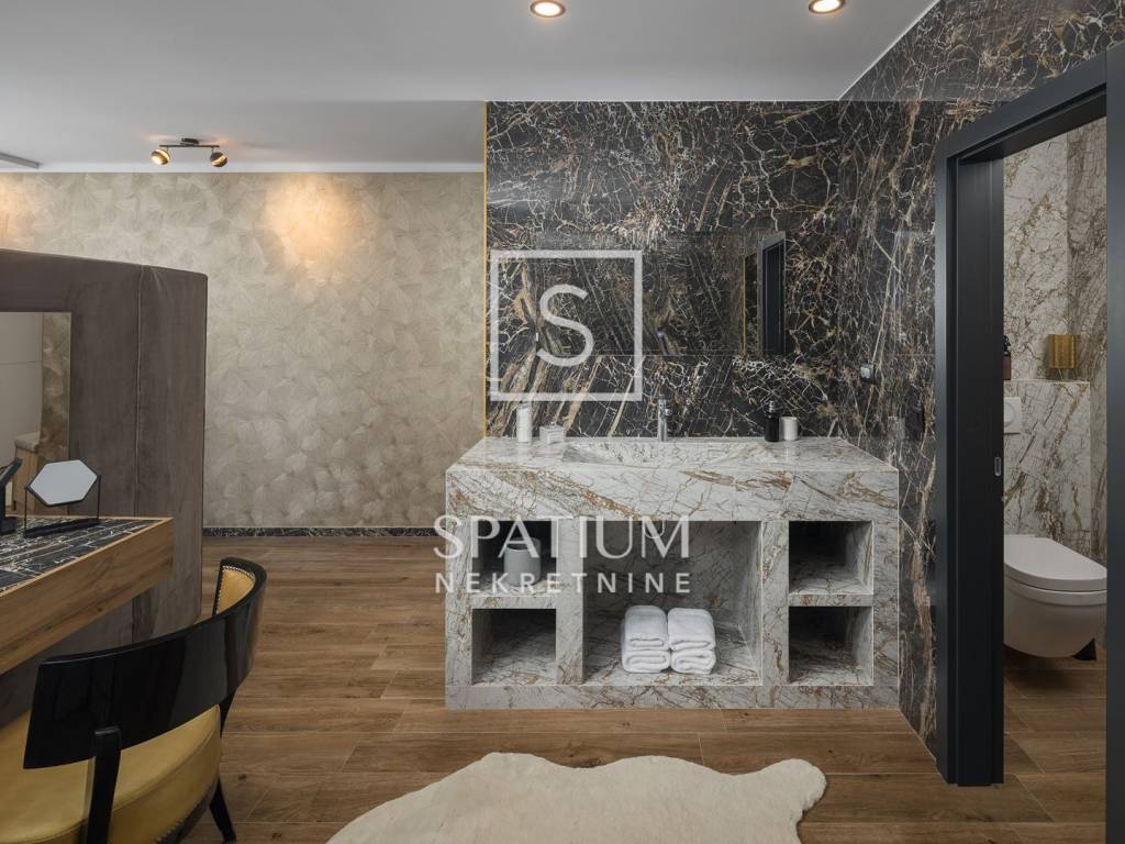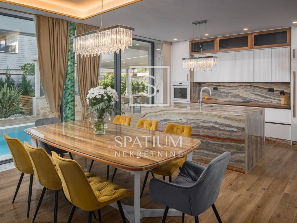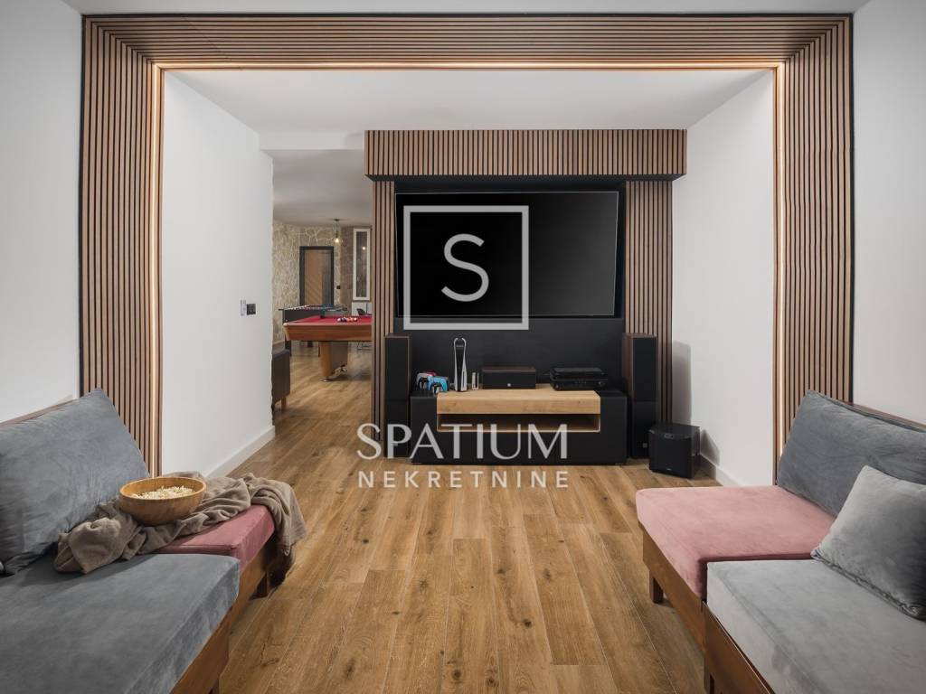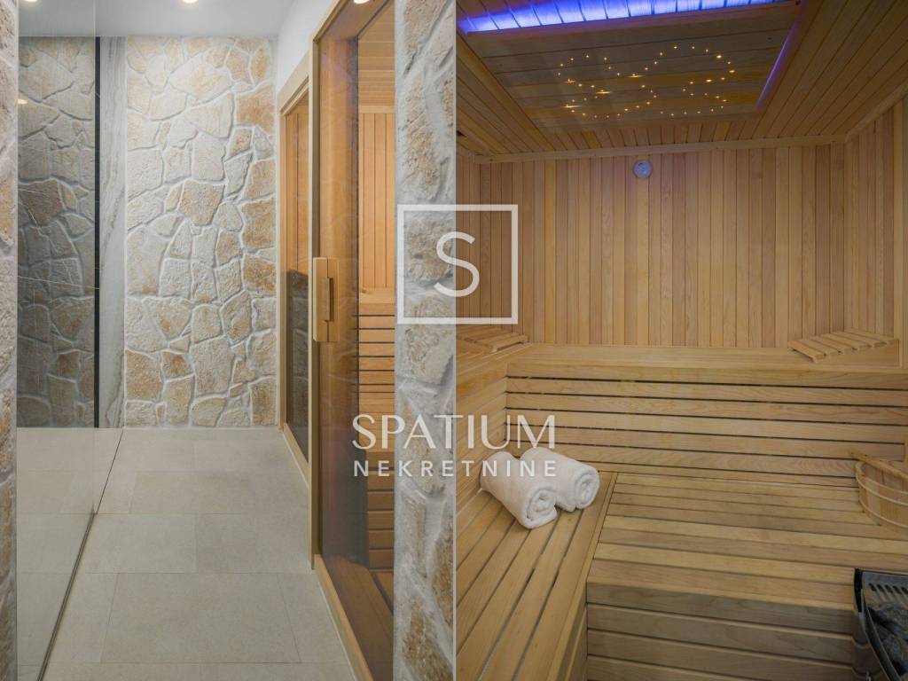 POREČ, FUNTANA – An exclusive villa for sale, situated on a 750 m² plot and offering 320 m² of carefully designed living space spread over three floors. The ground floor features a spacious open-plan living room with a modern kitchen and dining area, elegantly complemented by a fireplace and guest toilet. The first floor comprises four bedrooms, each with a private bathroom and access to a terrace with sea views, while the rooftop terrace offers panoramic views of the surroundings. The basement includes a billiards room, home cinema and a relaxation area. The landscaped garden is enriched with a heated swimming pool, hydromassage tub, covered lounge area and private parking. Additional amenities such as underfloor heating, air conditioning in all rooms, solar panels, video surveillance and a sauna ensure maximum comfort and security throughout the year.