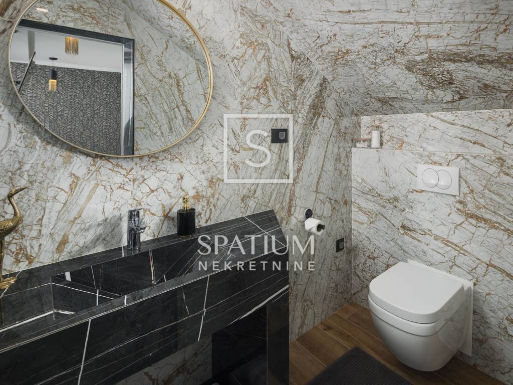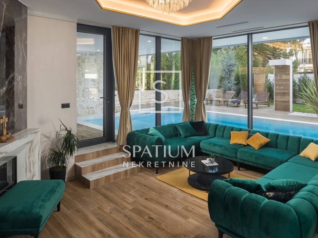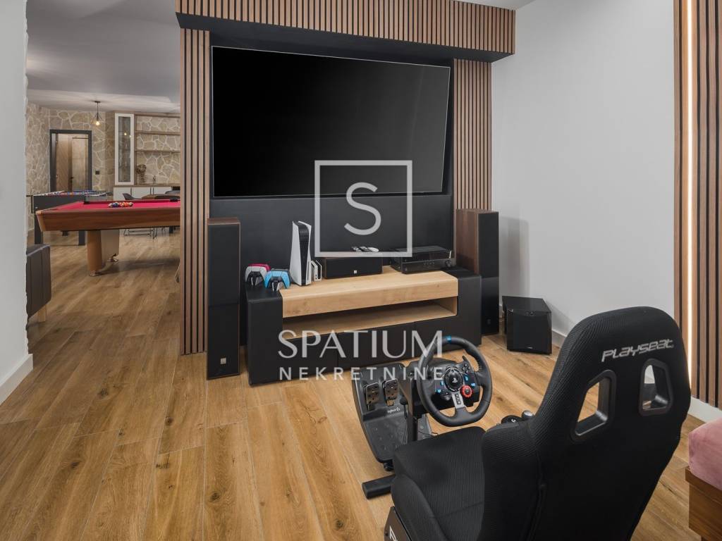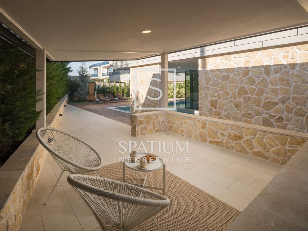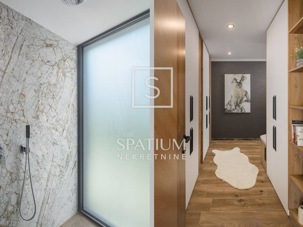 POREČ, FUNTANA – An exclusive villa for sale, situated on a 750 m² plot and offering 320 m² of carefully designed living space spread over three floors. The ground floor features a spacious open-plan living room with a modern kitchen and dining area, elegantly complemented by a fireplace and guest toilet. The first floor comprises four bedrooms, each with a private bathroom and access to a terrace with sea views, while the rooftop terrace offers panoramic views of the surroundings. The basement includes a billiards room, home cinema and a relaxation area. The landscaped garden is enriched with a heated swimming pool, hydromassage tub, covered lounge area and private parking. Additional amenities such as underfloor heating, air conditioning in all rooms, solar panels, video surveillance and a sauna ensure maximum comfort and security throughout the year.