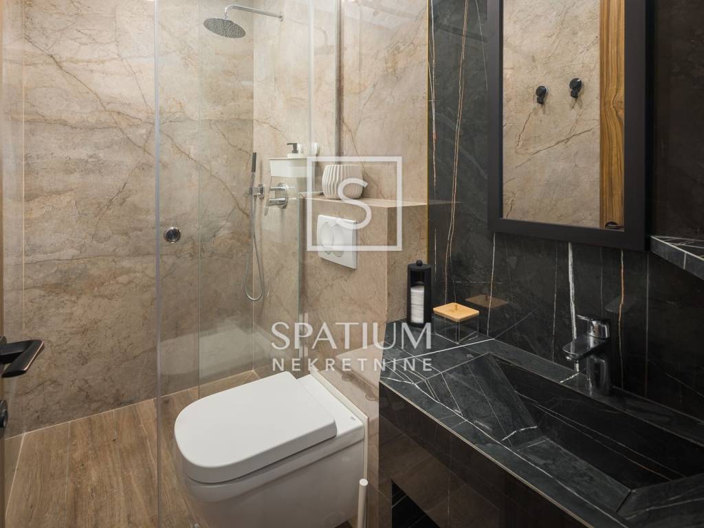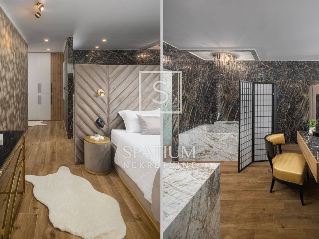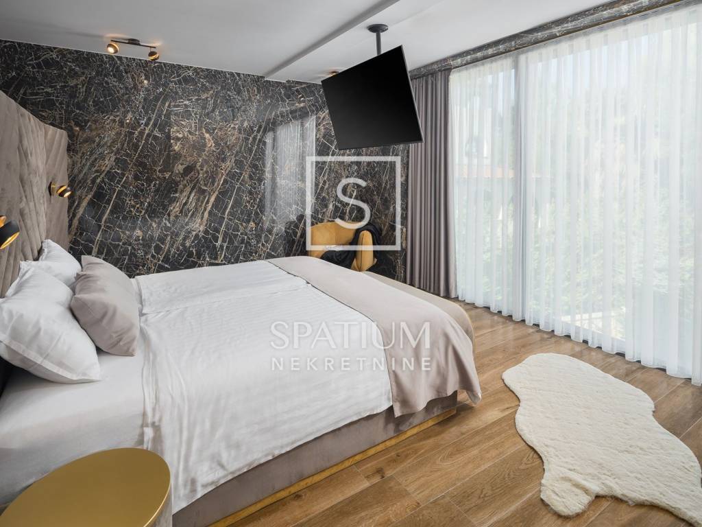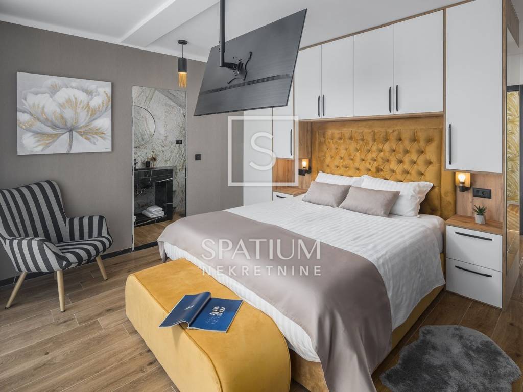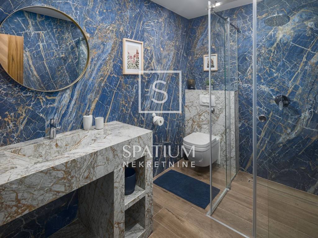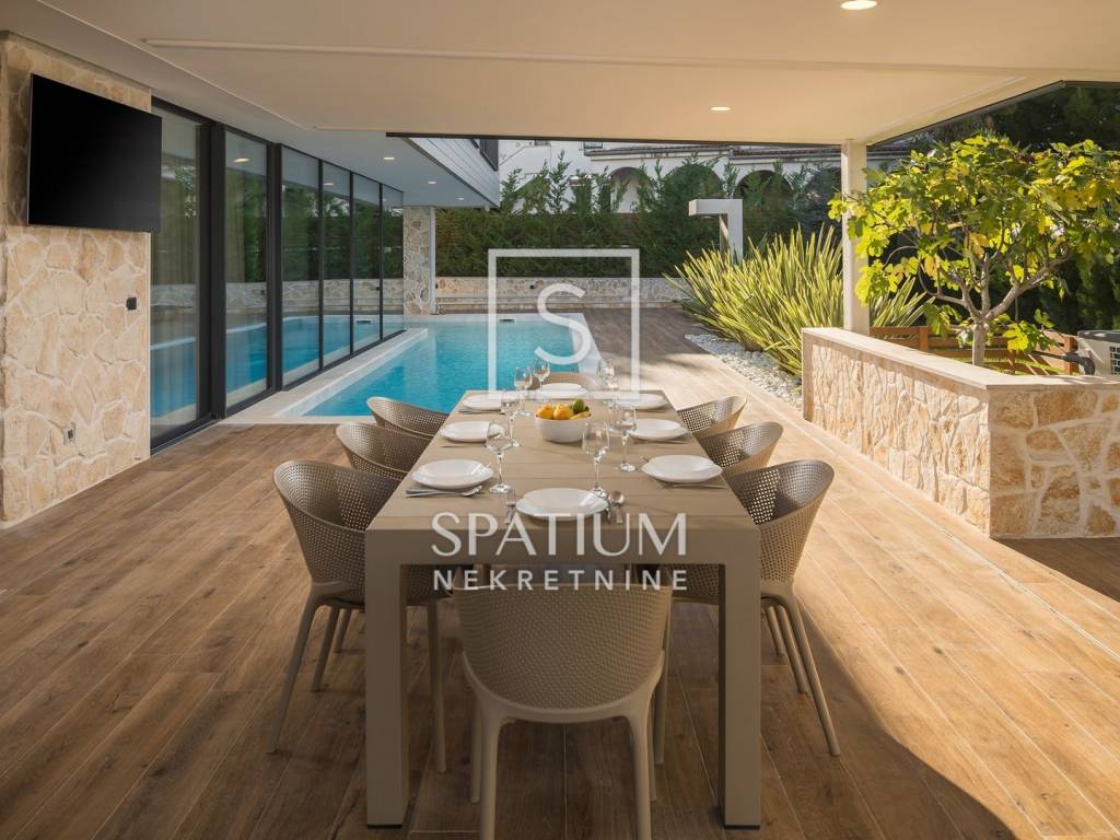 POREČ, FUNTANA – An exclusive villa for sale, situated on a 750 m² plot and offering 320 m² of carefully designed living space spread over three floors. The ground floor features a spacious open-plan living room with a modern kitchen and dining area, elegantly complemented by a fireplace and guest toilet. The first floor comprises four bedrooms, each with a private bathroom and access to a terrace with sea views, while the rooftop terrace offers panoramic views of the surroundings. The basement includes a billiards room, home cinema and a relaxation area. The landscaped garden is enriched with a heated swimming pool, hydromassage tub, covered lounge area and private parking. Additional amenities such as underfloor heating, air conditioning in all rooms, solar panels, video surveillance and a sauna ensure maximum comfort and security throughout the year.