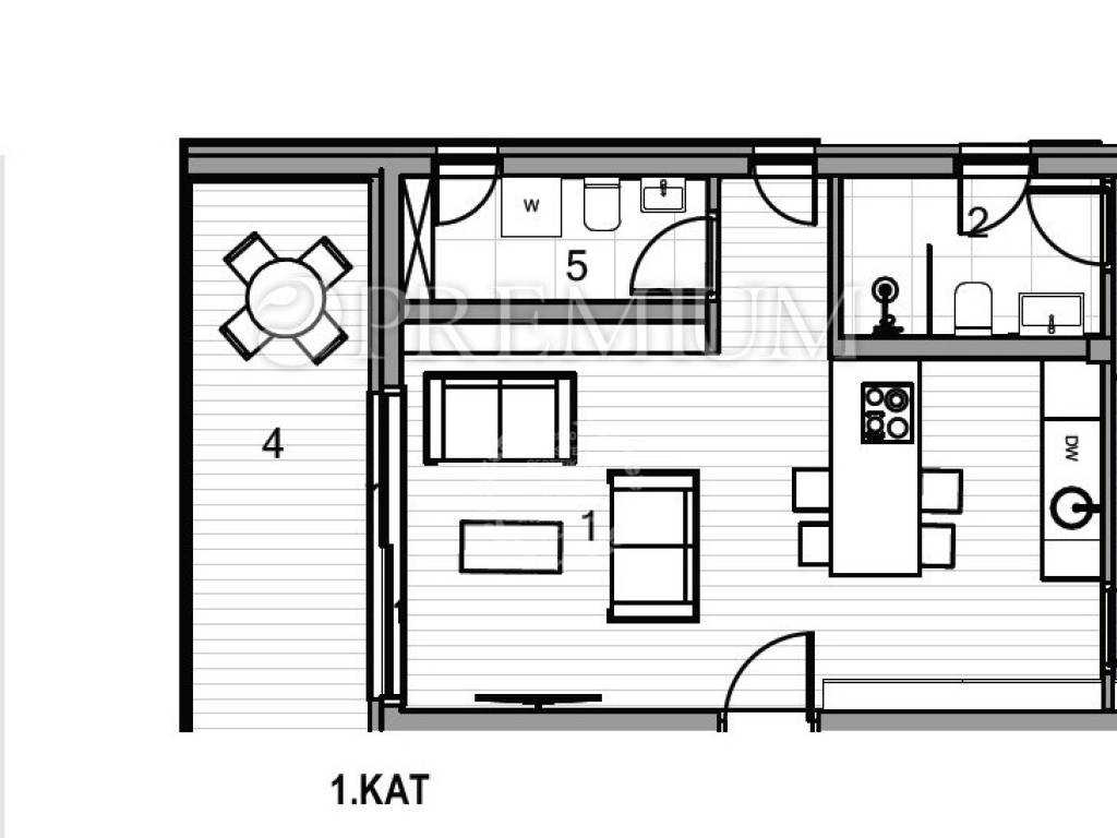 It consists of an entrance area, a guest WC, a laundry room, 1 bedroom with a wardrobe space, a kitchen with a dining area, and a living room with access to the terrace. A special feature of this apartment is its functional and spacious room layout.