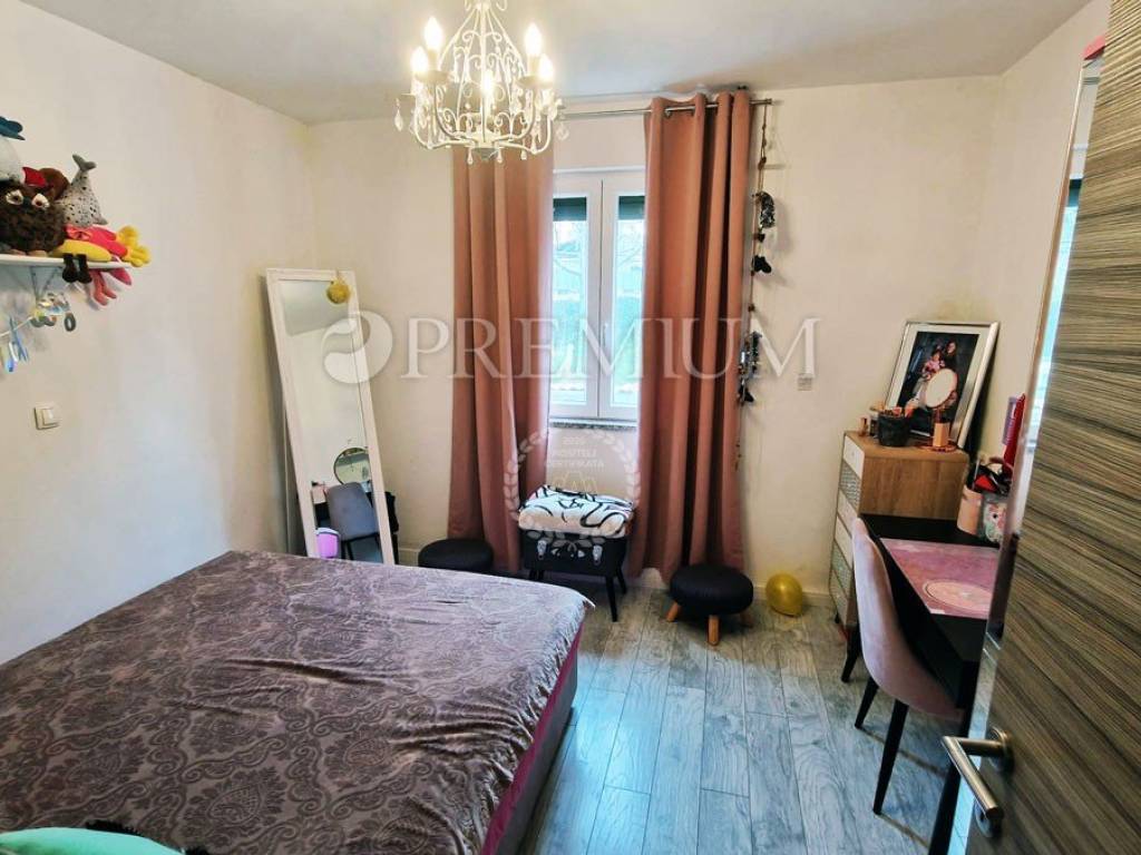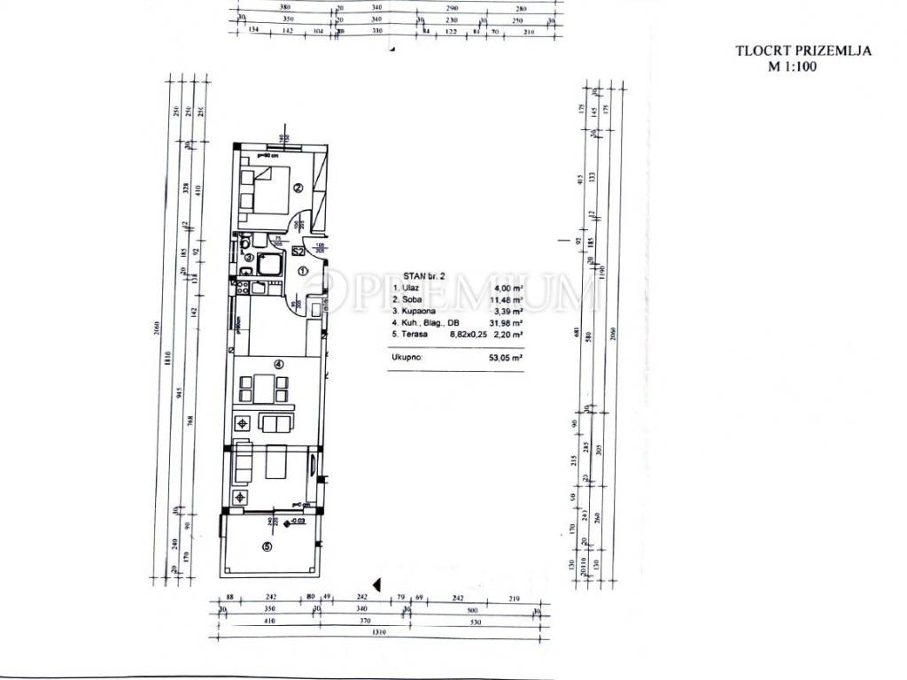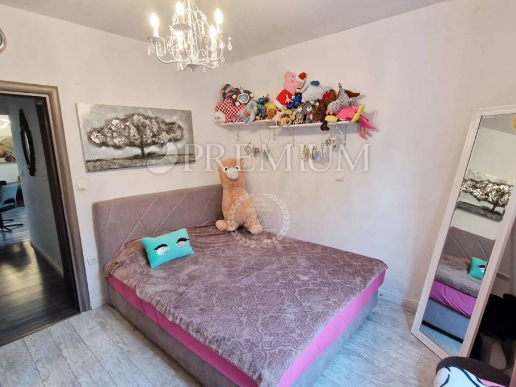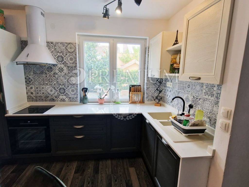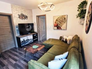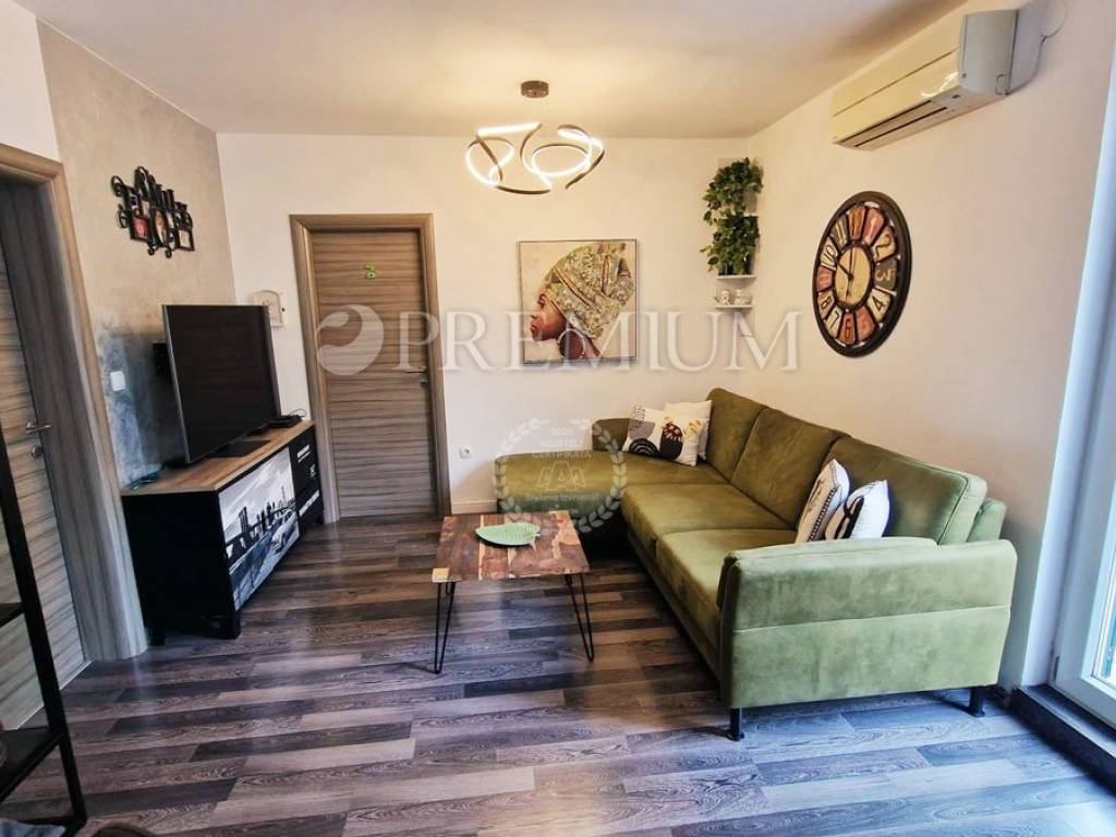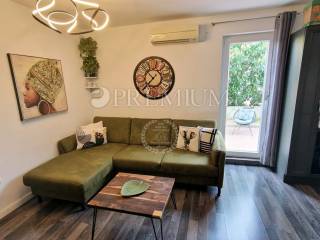 Island of Krk, town of Krk, sale of an apartment on the ground floor of a mixed-use building consisting of seven residential units and one commercial unit. The apartment with an area of 53m2 comprises a bathroom, two bedrooms, a kitchen and dining area, and a living room with access to a 10m2 terrace. This modernly furnished apartment is sold fully furnished, with furniture included in the price. Heating is provided by air conditioning, and high-quality PVC joinery and ceramic and laminate flooring are installed.