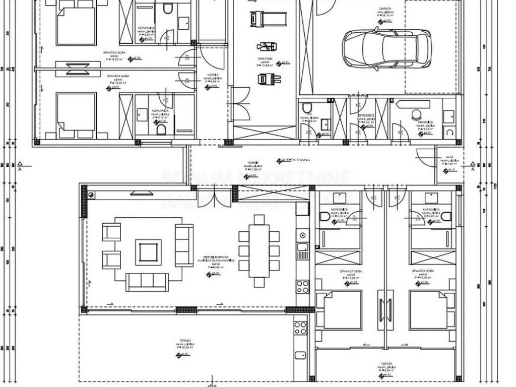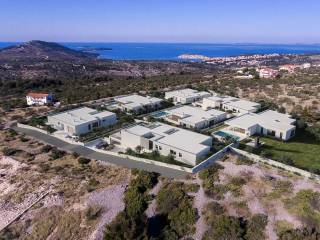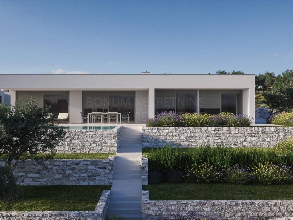 A beautiful modern villa in the hinterland of Primosten is for sale. It is located in a complex of seven similar villas. An interesting feature of these villas is that they are positioned so that each has an open view of the sea and the surrounding archipelago. The villa is a ground floor and consists of a garage, gym, storage and laundry in the first part and the entrance hall, four bedrooms (each with its own bathroom) and living room with kitchen and dining area in one unit. The villa has a modern design. The planned move into the villa is in 2022. The villa will be built on a plot of approximately 1200 m2 and the garden itself will be decorated in Mediterranean style. The proximity of the center of Primosten (2.5 km) and easy access from any part of Europe or the world give this property added value. An ideal property for an escape from hectic and stressful cities.