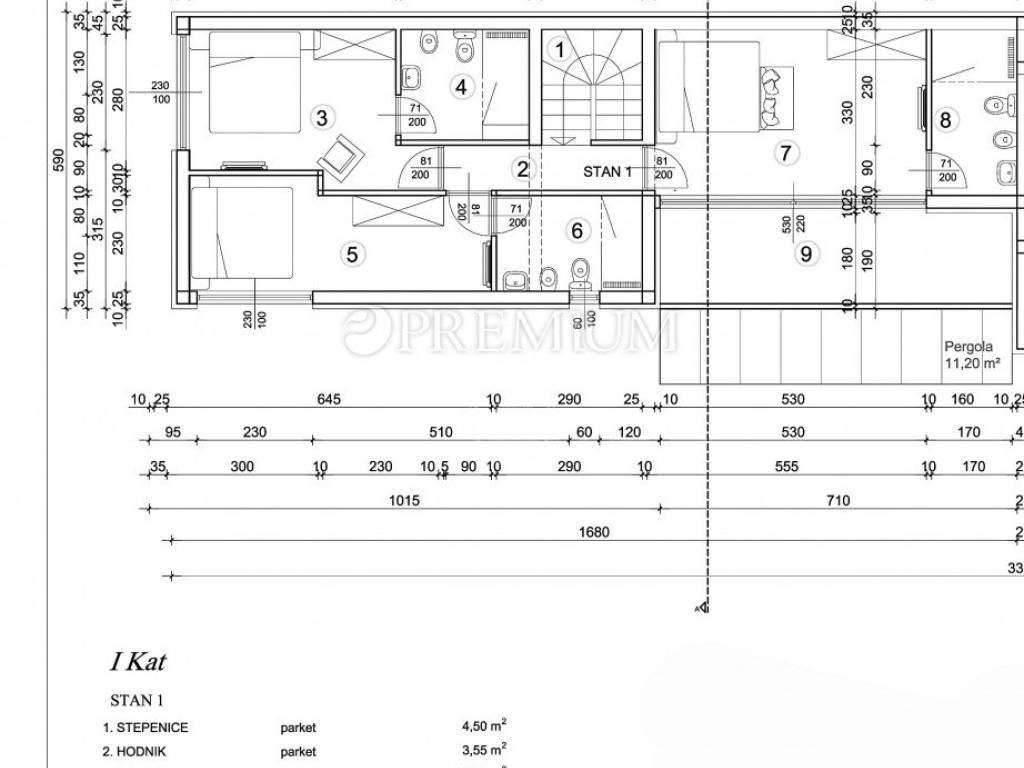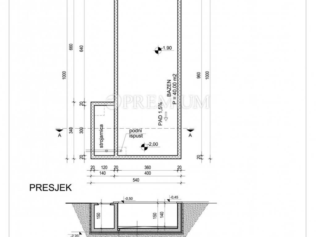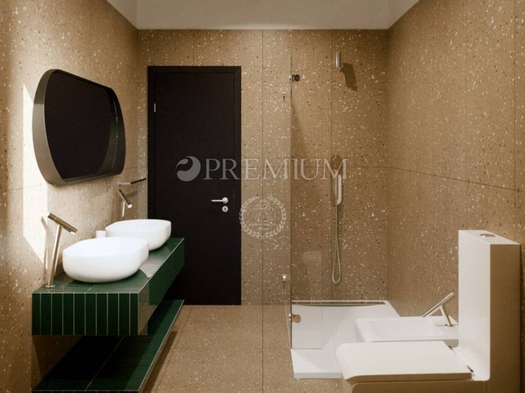 The ground floor, with an area of ​​80 m2, consists of an entrance area, a bedroom with a bathroom, a laundry room, a sauna with a shower, and an open space kitchen with a dining room and a living room, with an exit to the loggia, and a garden with a swimming pool (10 x 4 m ) with a sun deck, and a barbecue.
