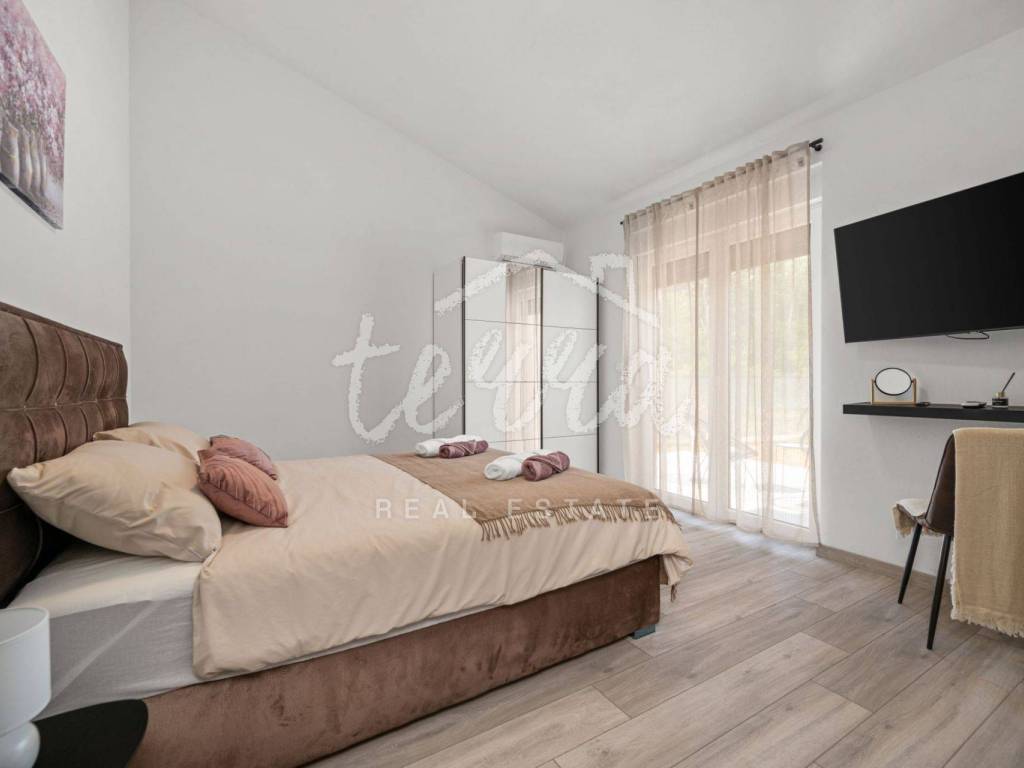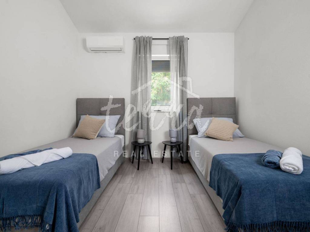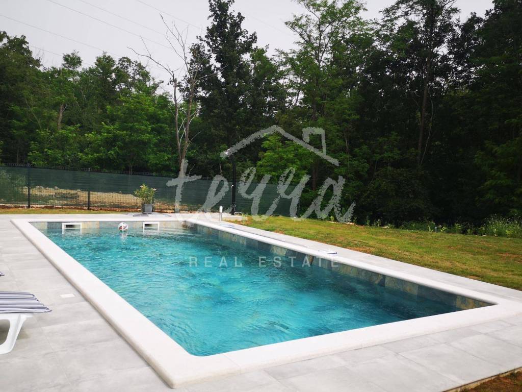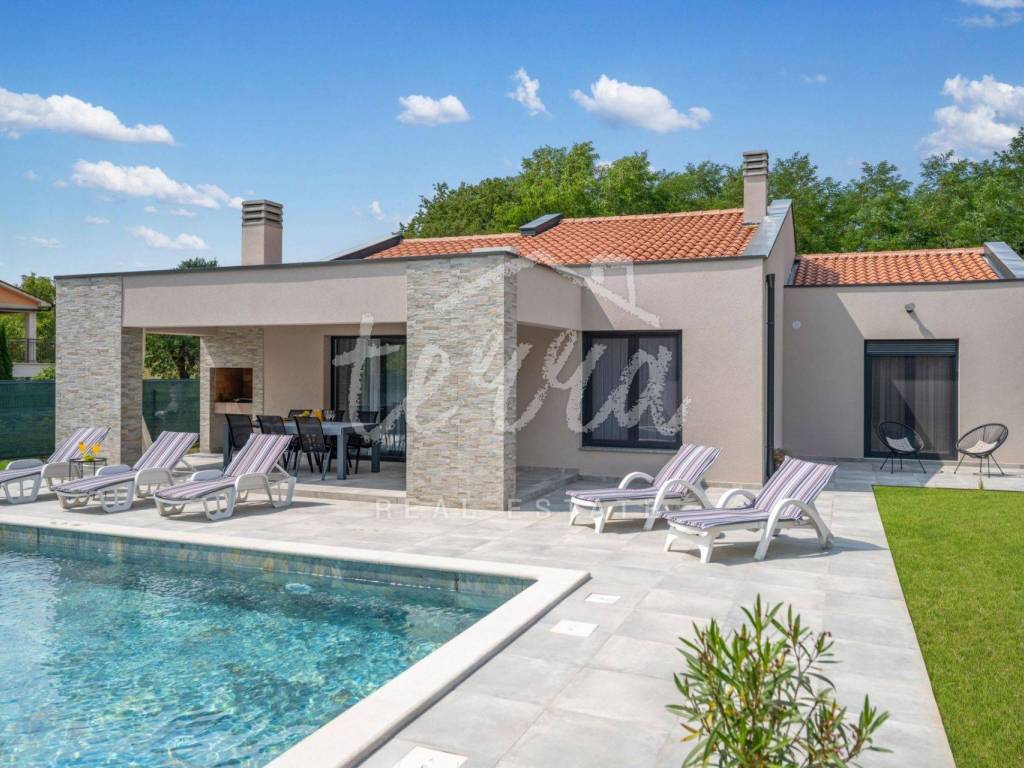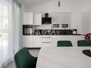 This beautiful detached one-story house is located in an extremely quiet location, surrounded by greenery and forest. The area of 126m2 consists of: entrance hall, living room with open kitchen and dining room, three bedrooms, of which the master bedroom has its own terrace, three bathrooms and a laundry room. Air conditioning in each room. Large glass walls lead to a covered terrace where there is a barbecue and a summer kitchen. In the extension of the terrace there is a swimming pool and sunbathing area surrounded by greenery and completely fenced. It is sold fully equipped. Parking for several cars. It is ideal for someone looking for peace and rest, but also real estate in the form of tourist rental.