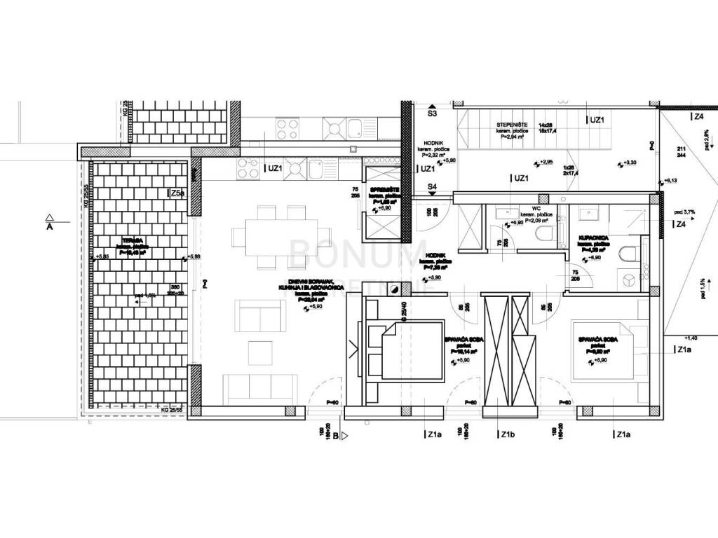 For sale is an attractive three-bedroom apartment located on the second floor of a modern building in Žaborić, just 130 meters from the sea. The apartment, with a total living area of ​​64.35 m², consists of three bedrooms, a kitchen with a dining room and a living room, a hallway, a storage room, a bathroom and an additional toilet.