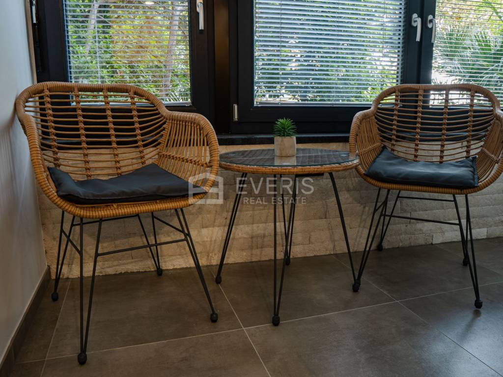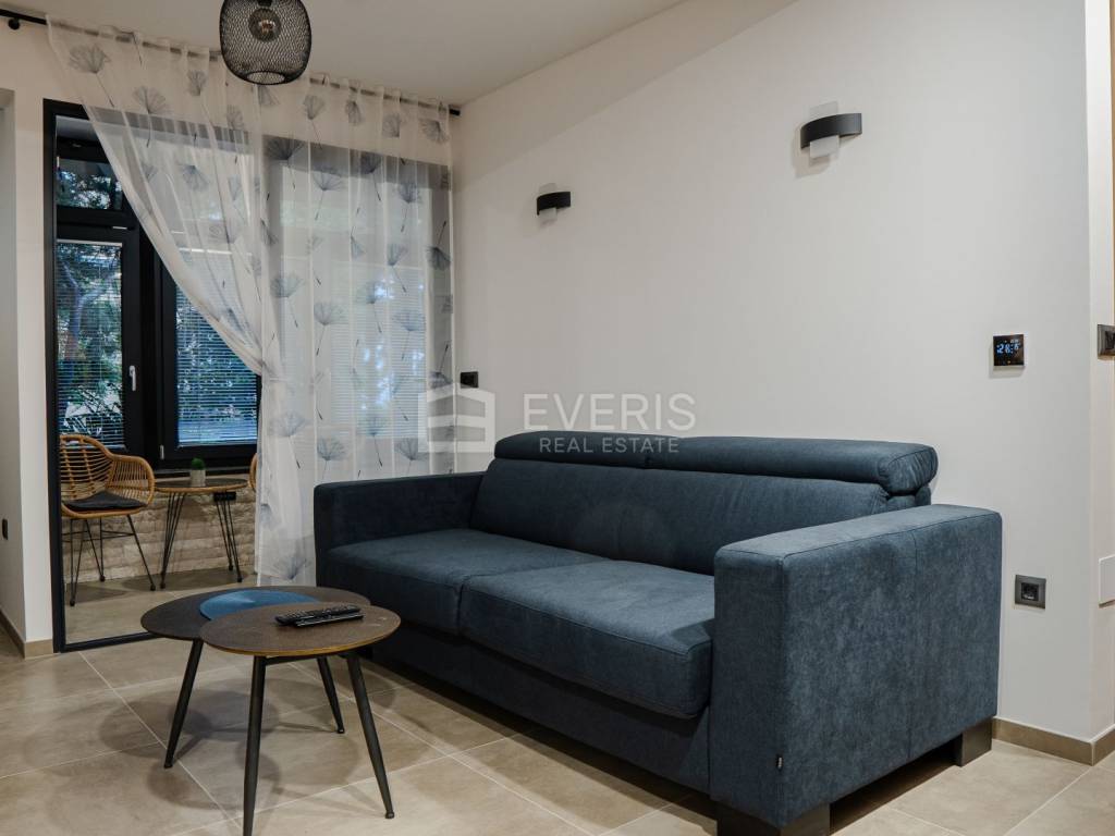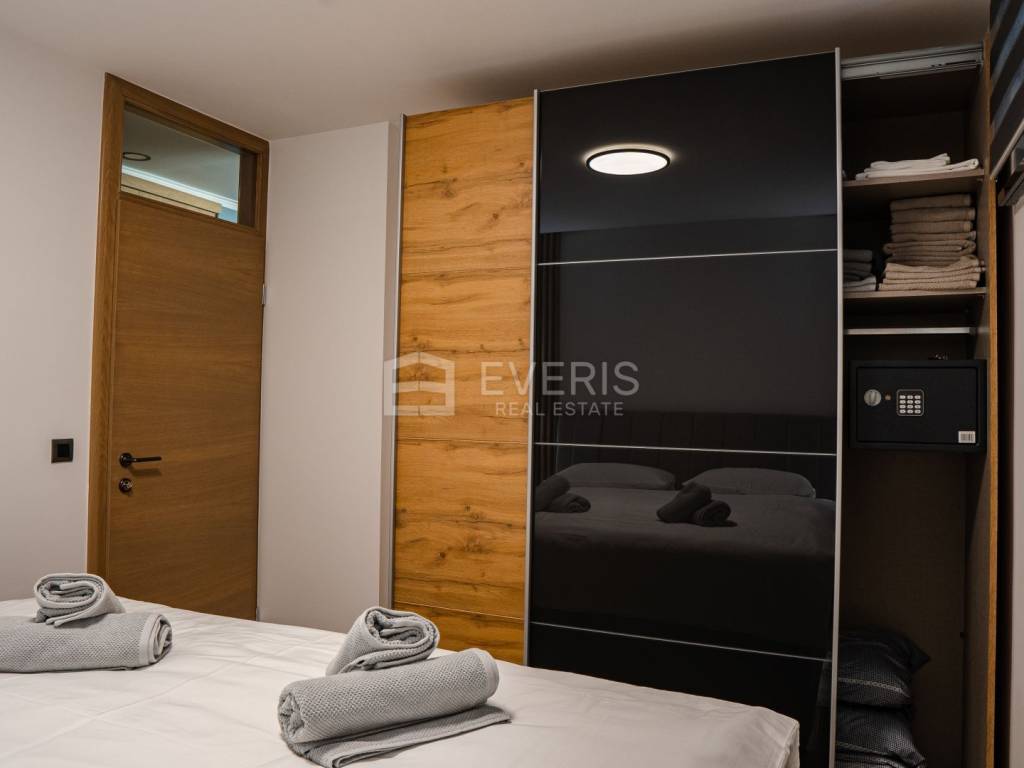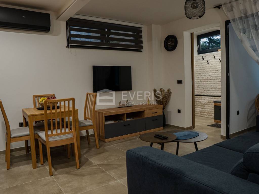 U suterenu objekta nalazi se kompletno uređeni i opremljeni apartman sa terasom od 12 m2, sa samostalnim izlazom na LUNGOMARE i more. Apartman se sastoji od spavaće sobe, dnevnog boravka sa kuhinjom, kupaonice i kupatila, terasa i spremište. Apartman je kompletno opremljen i kategoriziran, instalirano podno grijanje i klima uređaji.