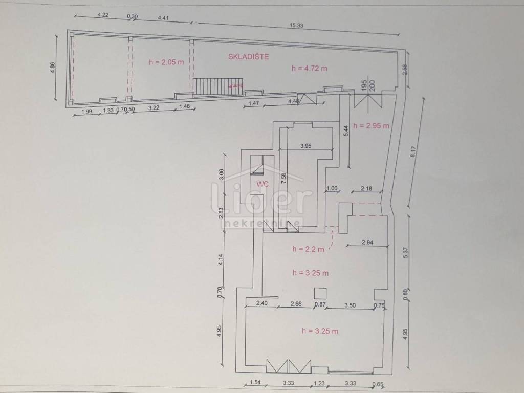 Predmetni poslovni prostor sastoji se od 143,39m2 prodajnog prostora sa pripadajućim uredom od 24,23m2, čajnom kuhinjom i wc-om od 8,66m2 te skladišnog prostora od 145,07m2, sveukupne površine. Visina prodajnog prostora je 326cm, a visina skladišnog prostora u najvišem dijelu iznosi 462cm.